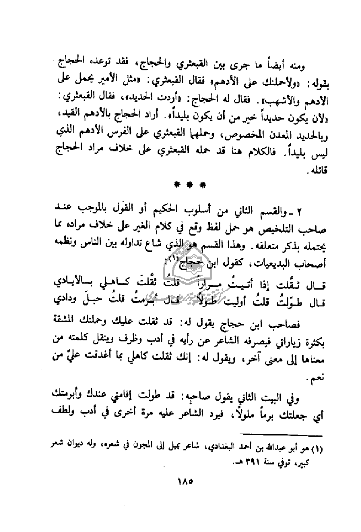 الغير على خلاف مراده مما يحتمله بذكر متعلقه. وهذا القسم هو الذي شاع تداوله بين الناس ونظمه أصحاب البديعيات، كقول ابن حجاج (¬1):