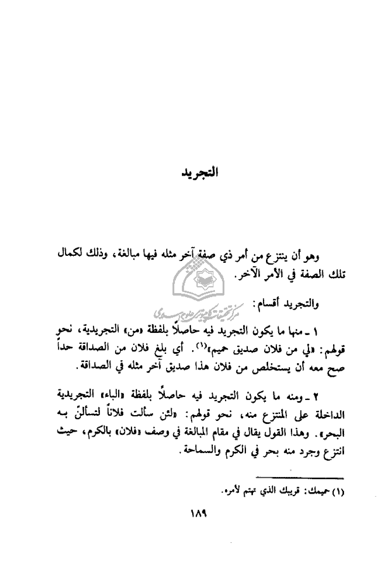 2 - ومنه ما يكون التجريد فيه حاصلا بلفظة «الباء» التجريدية الداخلة على المنتزع منه، نحو قولهم: «لئن سألت فلانا لتسألنّ به البحر». وهذا القول يقال في مقام المبالغة في وصف «فلان» بالكرم، حيث انتزع وجرد منه بحر في الكرم والسماحة.