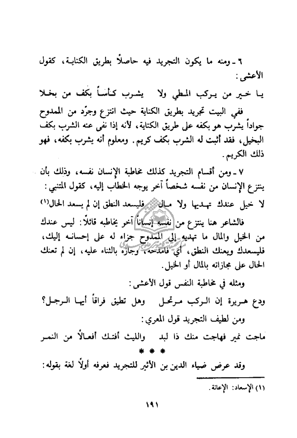 7 - ومن أقسام التجريد كذلك مخاطبة الإنسان نفسه، وذلك بأن ينتزع الإنسان من نفسه شخصا آخر يوجه الخطاب إليه، كقول المتنبي: