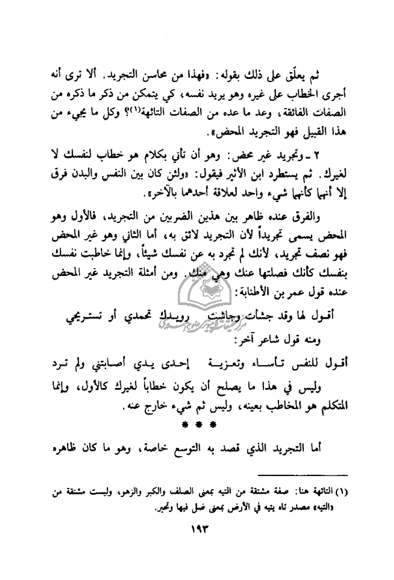 2 - وتجريد غير محض: وهو أن تأتي بكلام هو خطاب لنفسك لا لغيرك. ثم يستطرد ابن الأثير فيقول: «ولئن كان بين النفس والبدن فرق إلا أنهما كأنهما شيء واحد لعلاقة أحدهما بالآخر».