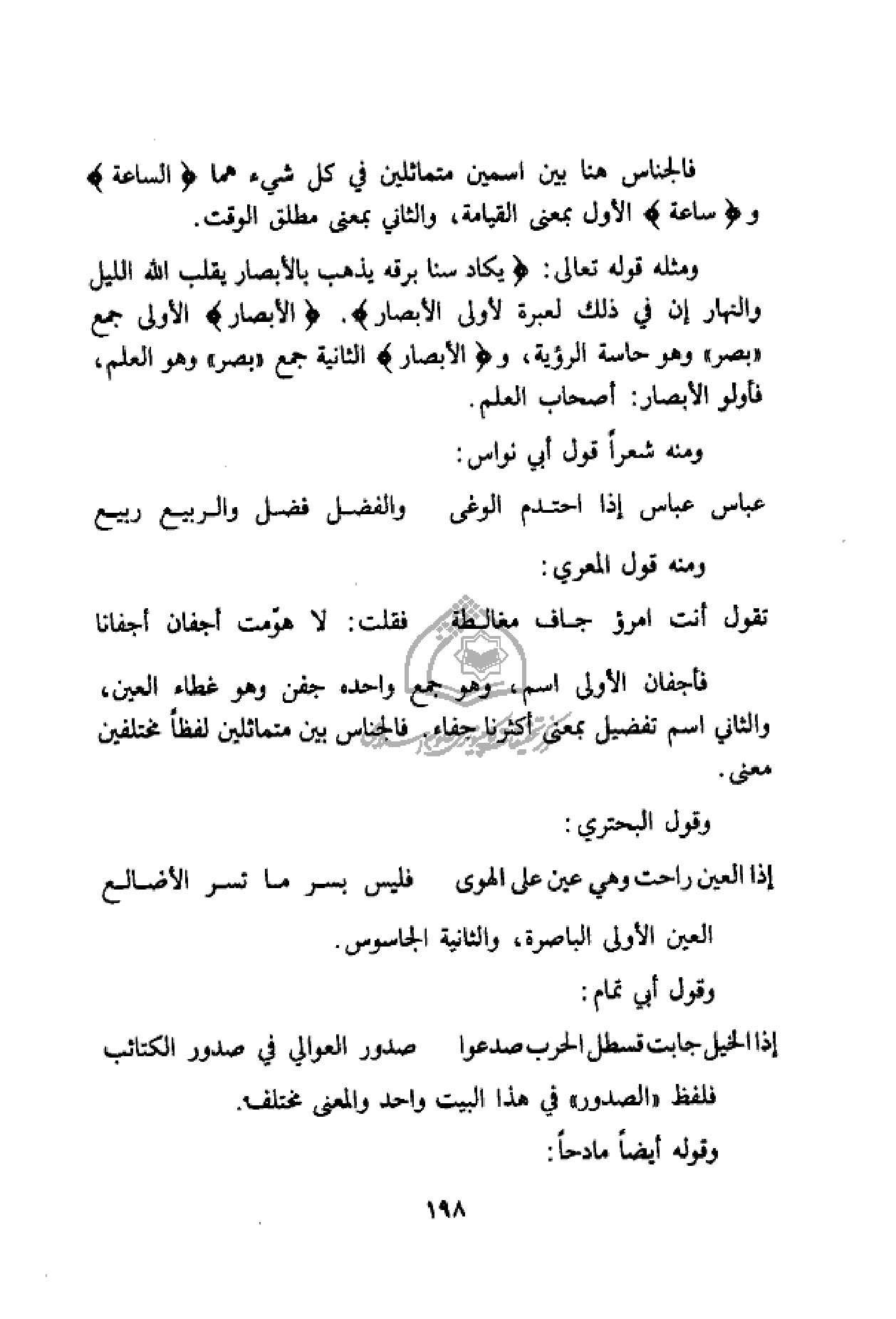 ومثله قوله تعالى: يَكادُ سَنا بَرْقِهِ يَذْهَبُ بِالْأَبْصارِ يُقَلِّبُ اللَّهُ اللَّيْلَ وَالنَّهارَ إِنَّ فِي ذلِكَ لَعِبْرَةً لِأُولِي الْأَبْصارِ. الْأَبْصارِ الأولى جمع «بصر» وهو حاسة الرؤية، والْأَبْصارِ الثانية جمع «بصر» وهو العلم، فأولو الأبصار: أصحاب العلم.