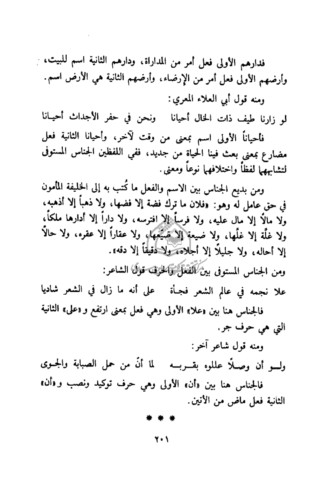 فدارهم الأولى فعل أمر من المداراة، ودارهم الثانية اسم للبيت، وأرضهم الأولى فعل أمر من الإرضاء، وأرضهم الثانية هي الأرض اسم.