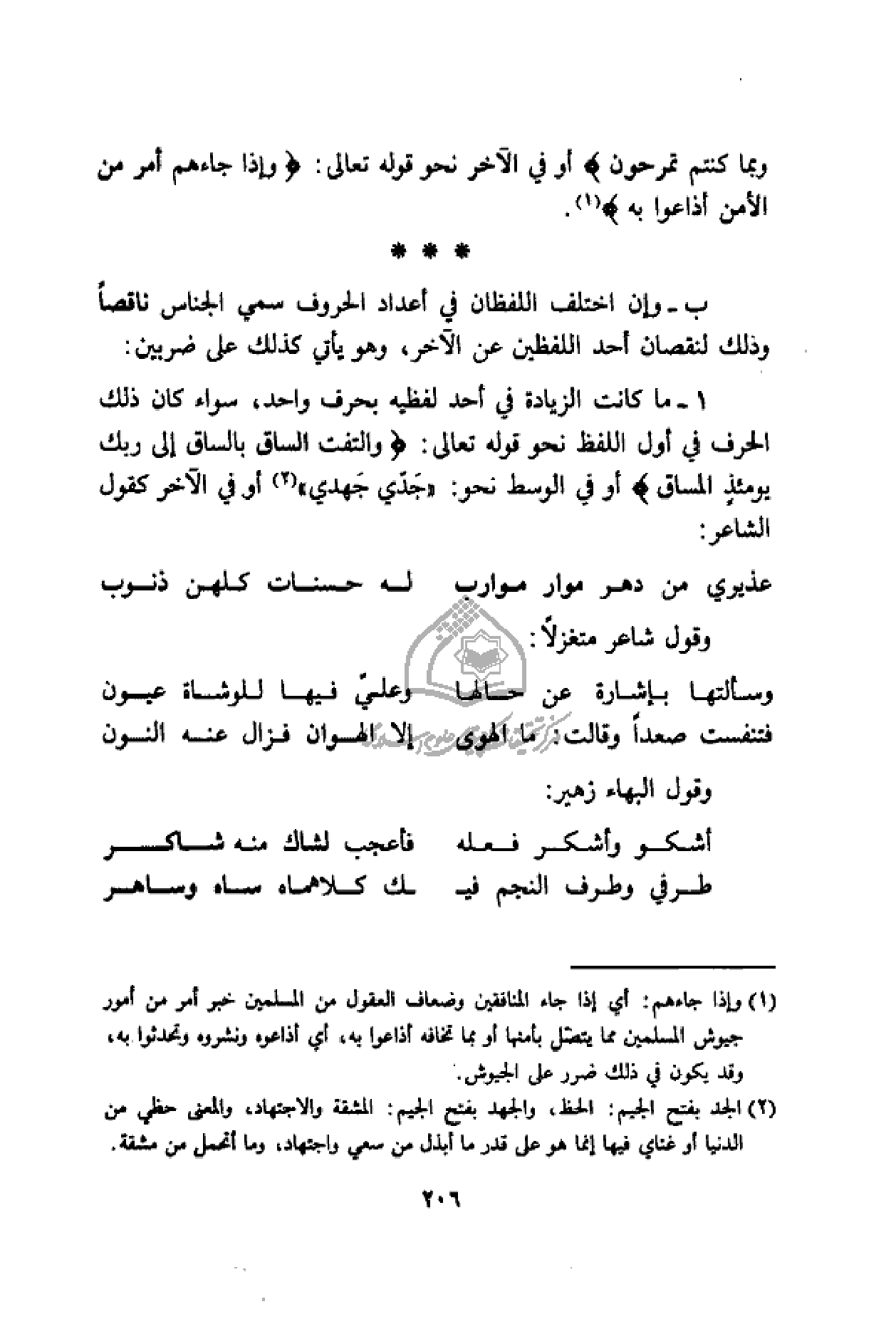 ب- وإن اختلف اللفظان في أعداد الحروف سمي الجناس ناقصا وذلك لنقصان أحد اللفظين عن الآخر، وهو يأتي كذلك على ضربين: