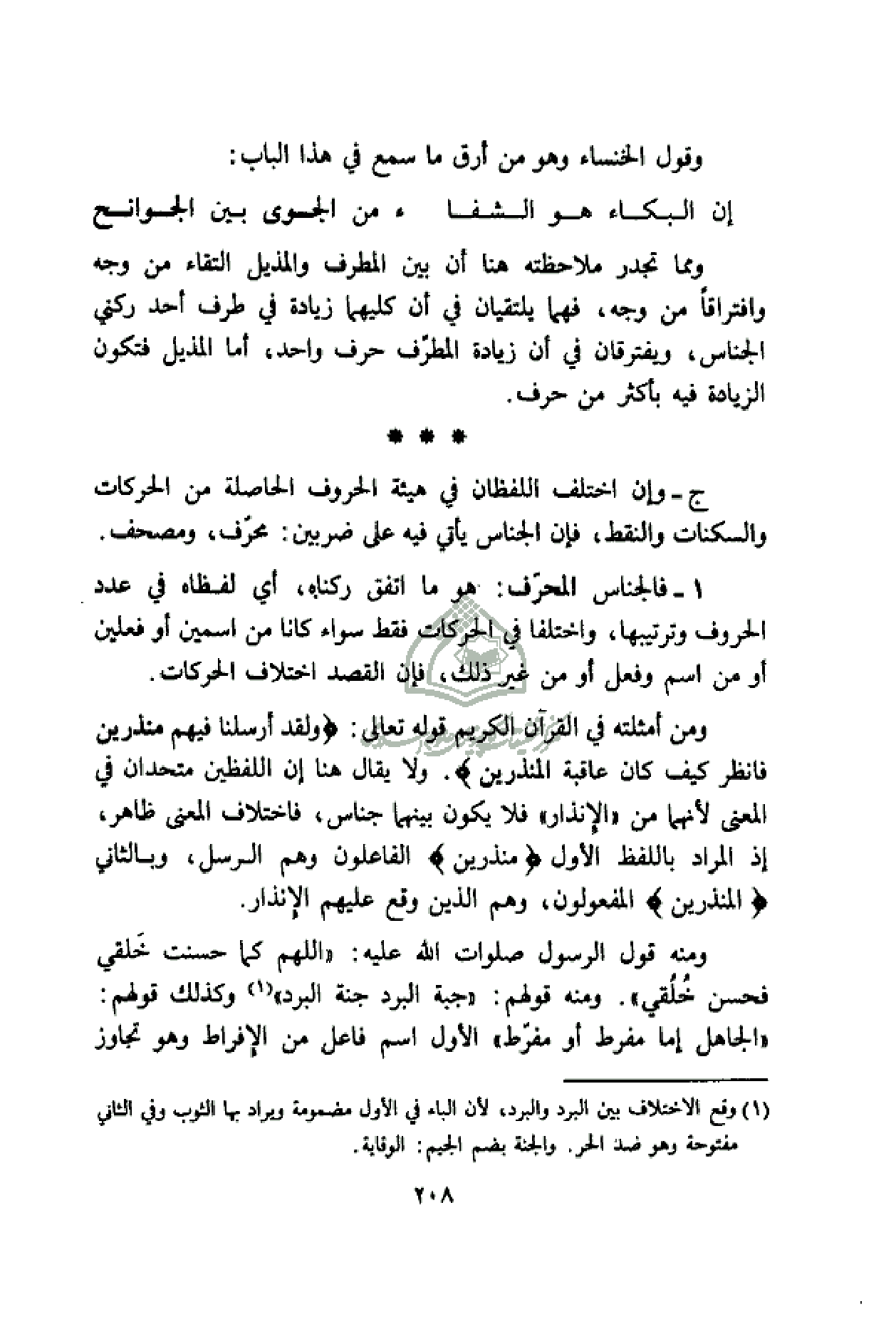 ج- وإن اختلف اللفظان في هيئة الحروف الحاصلة من الحركات والسكنات والنقط، فإن الجناس يأتي فيه على ضربين: محرّف، ومصحف.