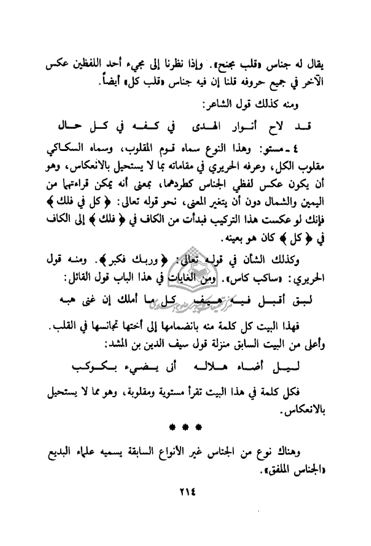 4 - مستو: وهذا النوع سماه قوم المقلوب، وسماه السكاكي مقلوب الكل، وعرفه الحريري في مقاماته بما لا يستحيل بالانعكاس، وهو أن يكون عكس لفظي الجناس كطردهما، بمعنى أنه يمكن قراءتهما من اليمين والشمال دون أن يتغير المعنى، نحو قوله تعالى: كُلٌّ فِي فَلَكٍ* فإنك لو عكست هذا التركيب فبدأت من الكاف في فَلَكٍ* إلى الكاف في كُلٌّ* كان هو بعينه.
