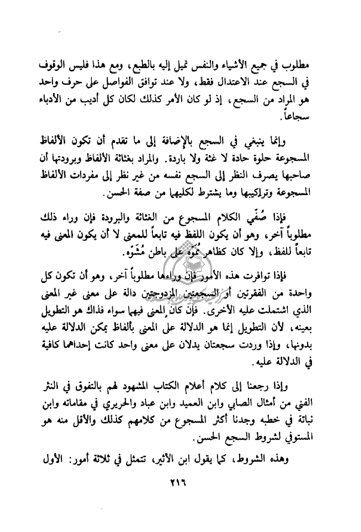 وإذا رجعنا إلى كلام أعلام الكتاب المشهود لهم بالتفوق في النثر الفني من أمثال الصابي وابن العميد وابن عباد والحريري في مقاماته وابن نباتة في خطبه وجدنا أكثر المسجوع من كلامهم كذلك والأقل منه هو المستوفي لشروط السجع الحسن.