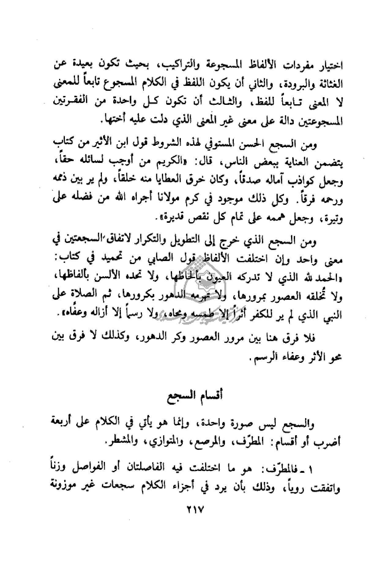 ومن السجع الحسن المستوفي لهذه الشروط قول ابن الأثير من كتاب يتضمن العناية ببعض الناس، قال: «الكريم من أوجب لسائله حقا، وجعل كواذب آماله صدقا، وكان خرق العطايا منه خلقا، ولم ير بين ذممه ورحمه فرقا. وكل ذلك موجود في كرم مولانا أجراه الله من فضله على وتيرة، وجعل هممه على تمام كل نقص قديرة».