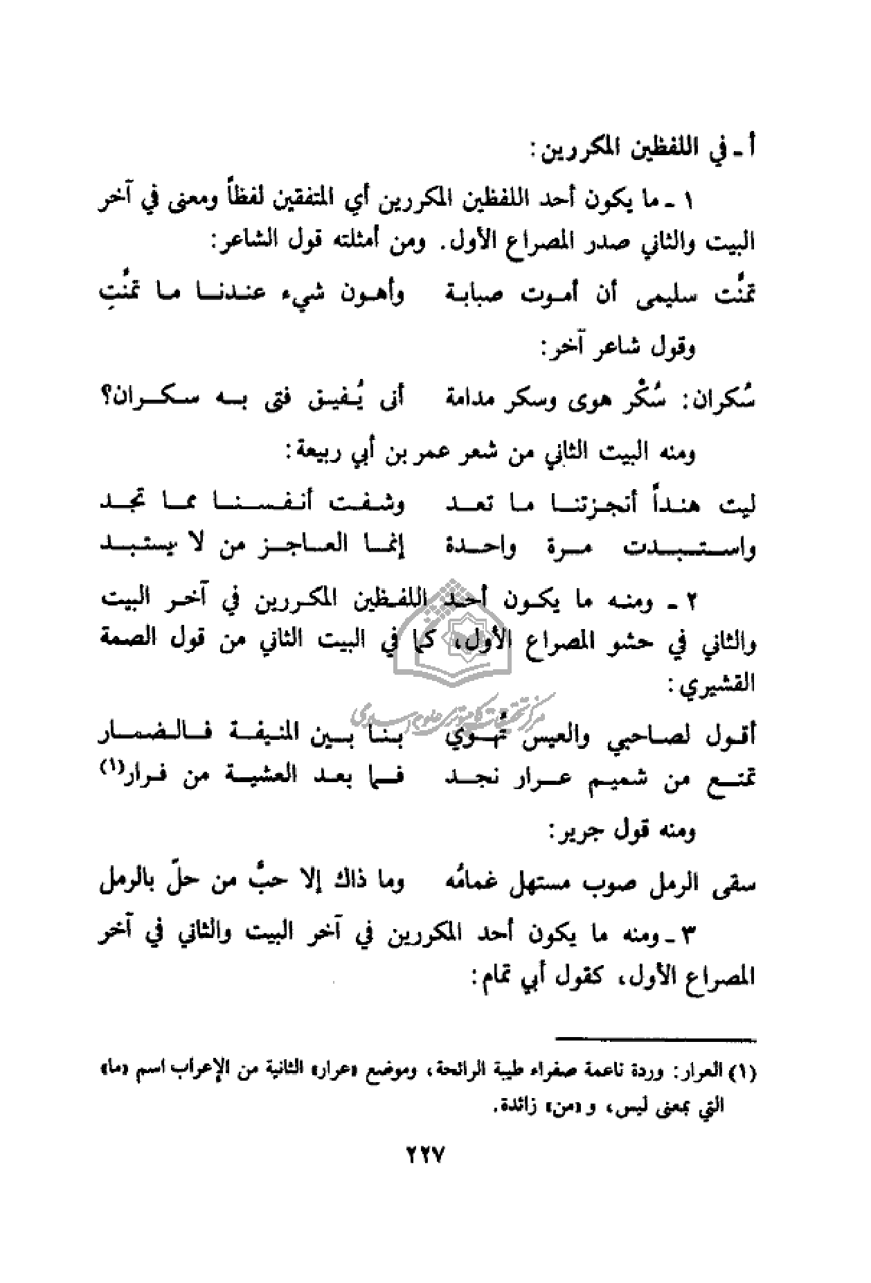 3 - ومنه ما يكون أحد المكررين في آخر البيت والثاني في آخر المصراع الأول، كقول أبي تمام: