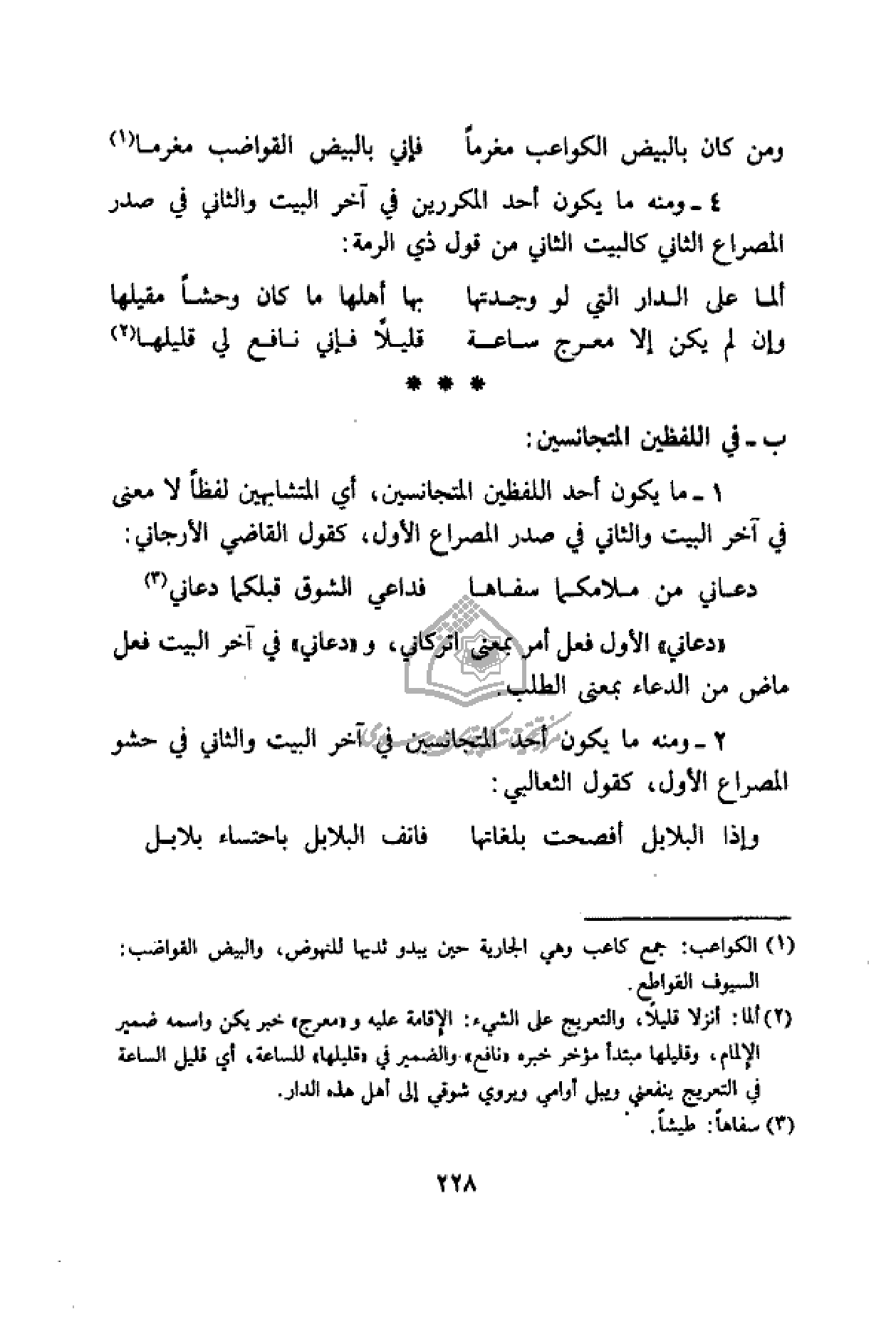 2 - ومنه ما يكون أحد المتجانسين في آخر البيت والثاني في حشو المصراع الأول، كقول الثعالبي: