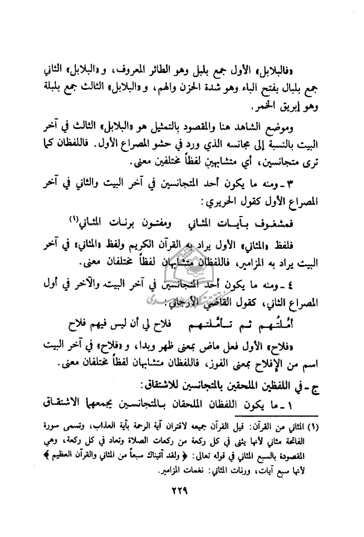 فلفظ «المثاني» الأول يراد به القرآن الكريم ولفظ «المثاني» في آخر البيت يراد به المزامير، فاللفظان متشابهان لفظا مختلفان معنى.