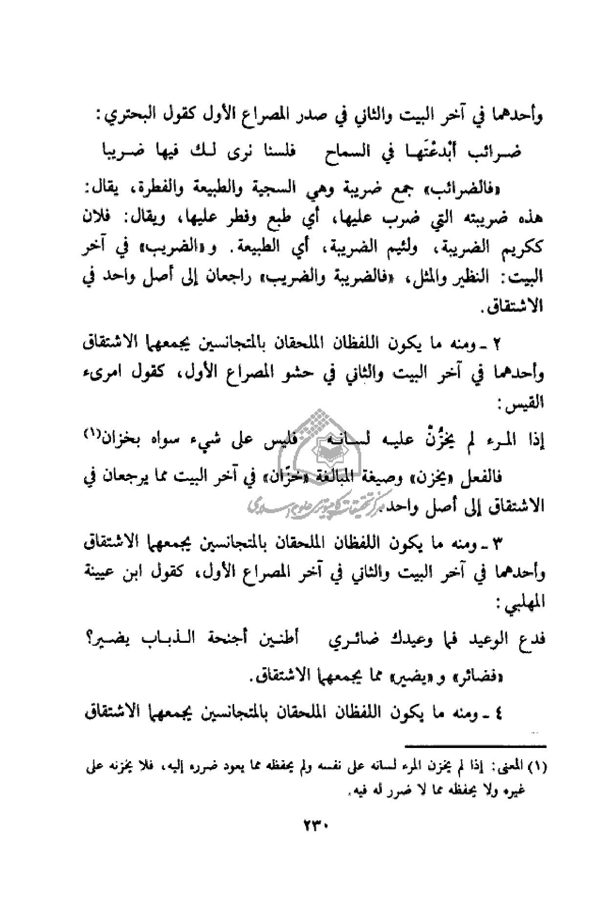 2 - ومنه ما يكون اللفظان الملحقان بالمتجانسين يجمعهما الاشتقاق وأحدهما في آخر البيت والثاني في حشو