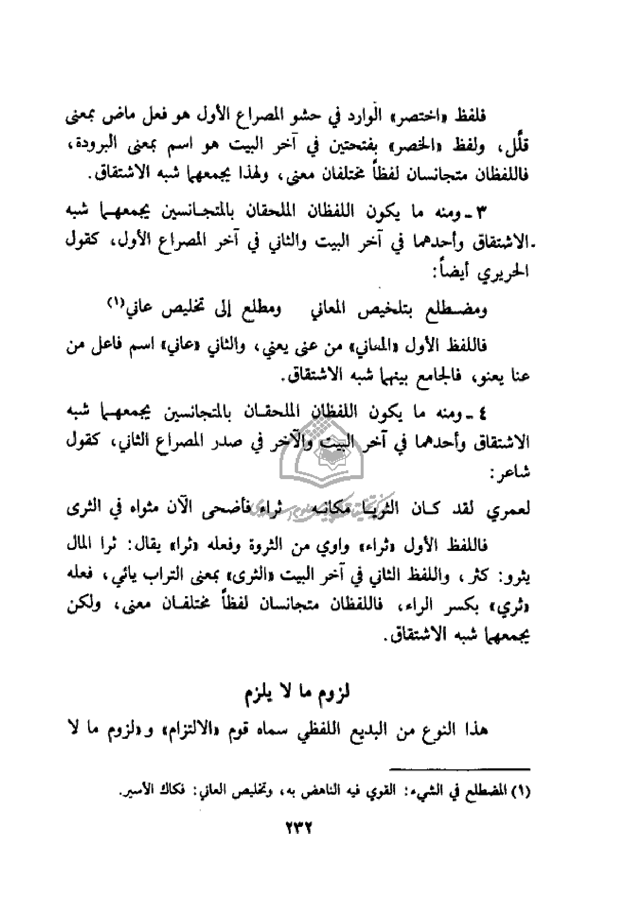 3 - ومنه ما يكون اللفظان الملحقان بالمتجانسين يجمعهما شبه الاشتقاق وأحدهما في آخر البيت والثاني في آخر المصراع الأول، كقول الحريري أيضا: