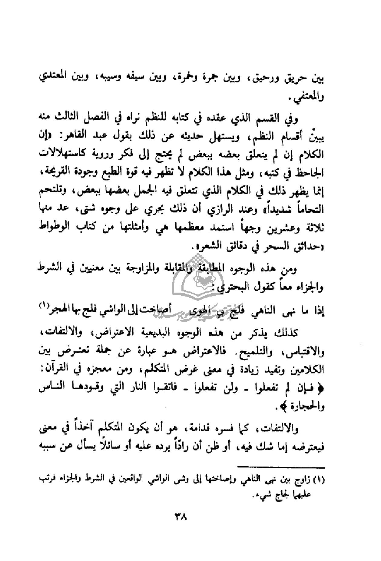 بقول عبد القاهر: «إن الكلام إن لم يتعلق بعضه ببعض لم يحتج إلى فكر وروية كاستهلالات الجاحظ في كتبه، ومثل هذا الكلام لا تظهر فيه قوة الطبع وجودة القريحة، إنما يظهر ذلك في الكلام الذي تتعلق فيه الجمل بعضها ببعض، وتلتحم التحاما شديدا» وعند الرازي أن ذلك يجري على وجوه شتى، عد منها ثلاثة وعشرين وجها استمد معظمها هي وأمثلتها من كتاب الوطواط «حدائق السحر في دقائق الشعر».