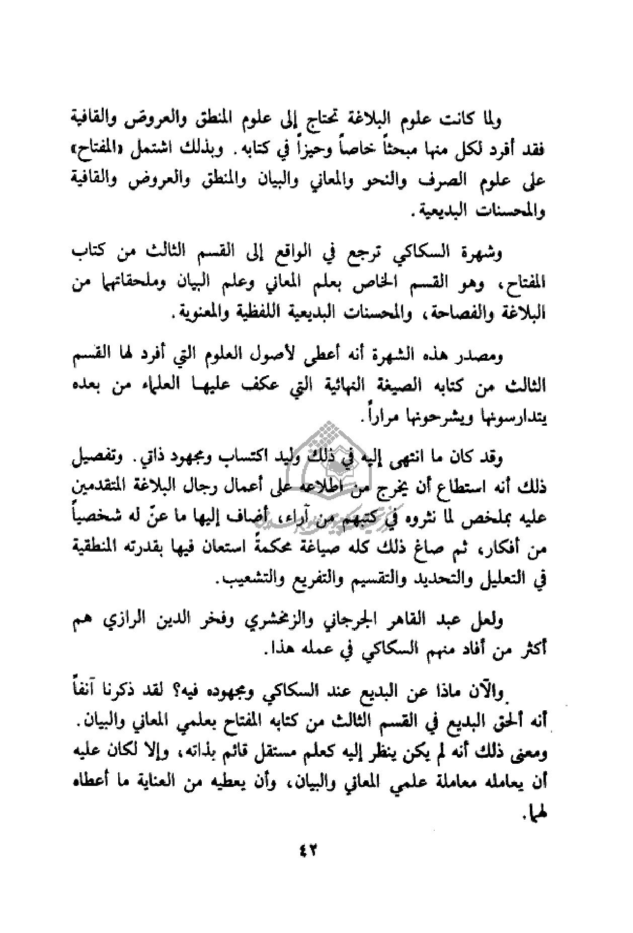 ولعل عبد القاهر الجرجاني والزمخشري وفخر الدين الرازي هم أكثر من أفاد منهم السكاكي في عمله هذا.