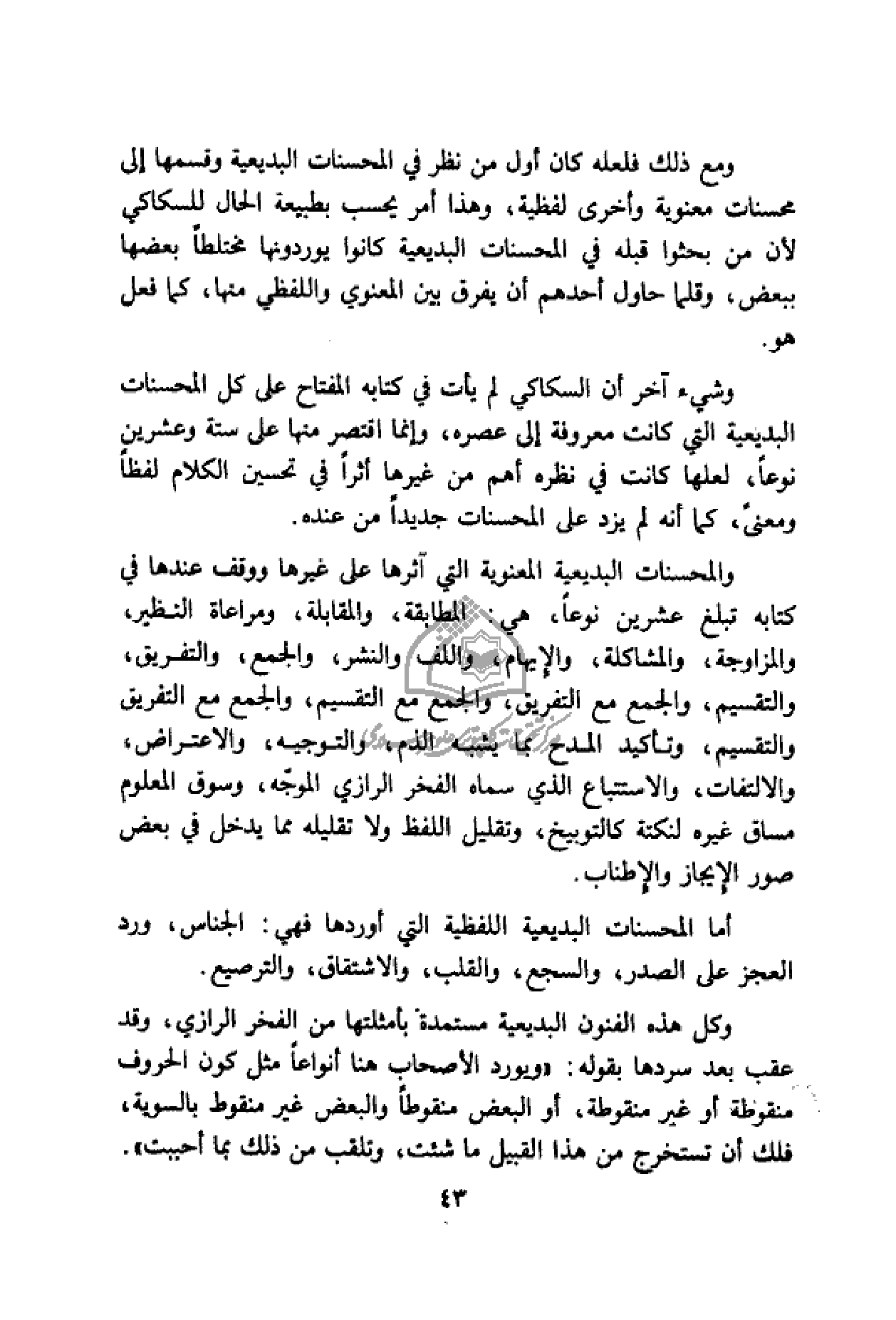 ومع ذلك فلعله كان أول من نظر في المحسنات البديعية وقسمها إلى محسنات معنوية وأخرى لفظية، وهذا أمر يحسب بطبيعة الحال للسكاكي لأن من بحثوا قبله في المحسنات البديعية كانوا يوردونها مختلطا بعضها ببعض، وقلما حاول أحدهم أن يفرق بين المعنوي واللفظي منها، كما فعل هو.