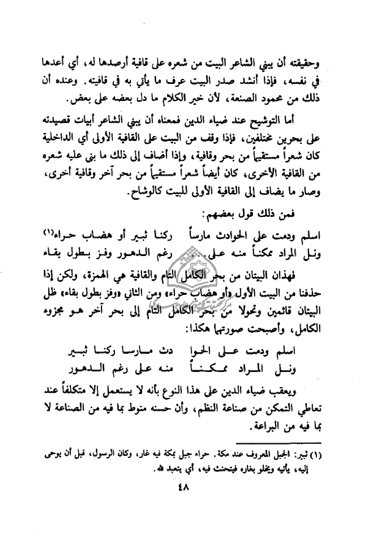 فهذان البيتان من بحر الكامل التام والقافية هي الهمزة، ولكن إذا حذفنا من البيت الأول «أو هضاب حراء» ومن الثاني «وفز بطول بقاء» ظل البيتان قائمين وتحولا من بحر الكامل التام إلى بحر آخر هو مجزوء الكامل، وأصبحت صورتهما هكذا: