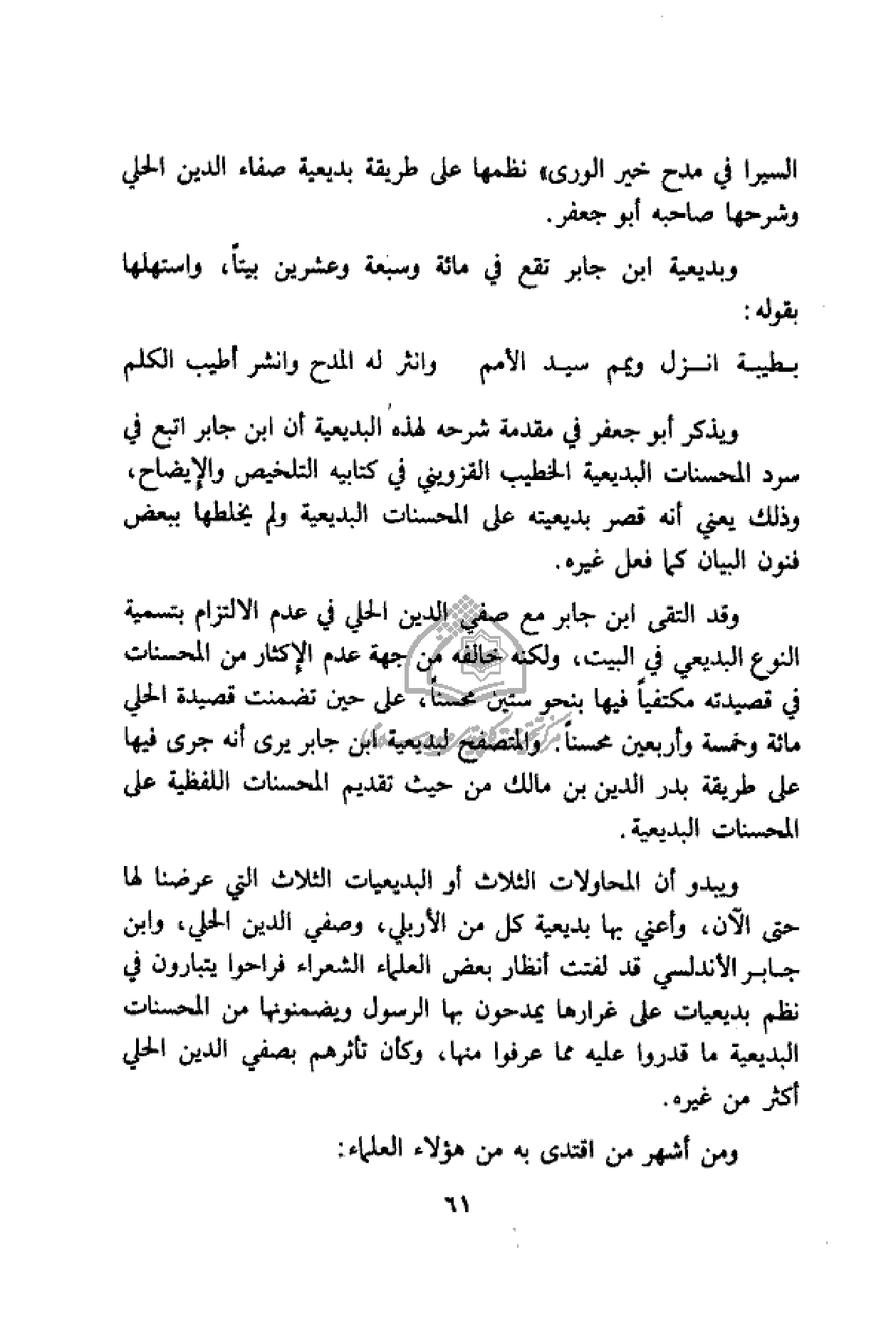 عدم الإكثار من المحسنات في قصيدته مكتفيا فيها بنحو ستين محسنا، على حين تضمنت قصيدة الحلي مائة وخمسة وأربعين محسنا. والمتصفح لبديعية ابن جابر يرى أنه جرى فيها على طريقة بدر الدين بن مالك من حيث تقديم المحسنات اللفظية على المحسنات البديعية.