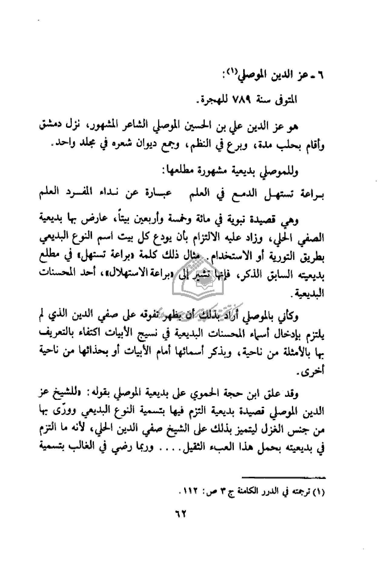 وكأني بالموصلي أراد بذلك أن يظهر تفوقه على صفي الدين الذي لم يلتزم بإدخال أسماء المحسنات البديعية في نسيج الأبيات اكتفاء بالتعريف بها بالأمثلة من ناحية، وبذكر أسمائها أمام الأبيات أو بحذائها من ناحية أخرى.