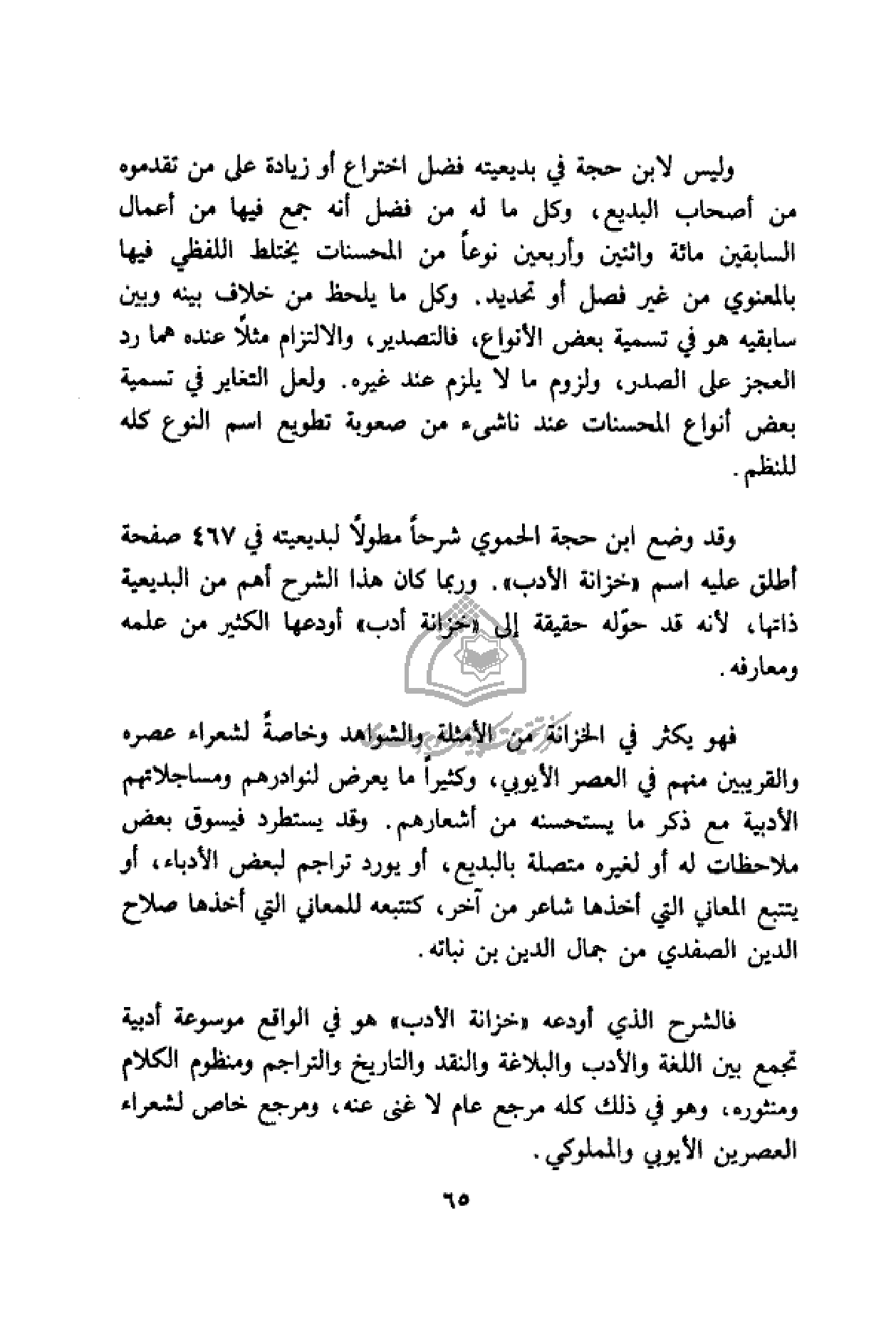 فالشرح الذي أودعه «خزانة الأدب» هو في الواقع موسوعة أدبية تجمع بين اللغة والأدب والبلاغة والنقد والتاريخ والتراجم ومنظوم الكلام ومنثوره، وهو في ذلك كله مرجع عام لا غنى عنه، ومرجع خاص لشعراء العصرين