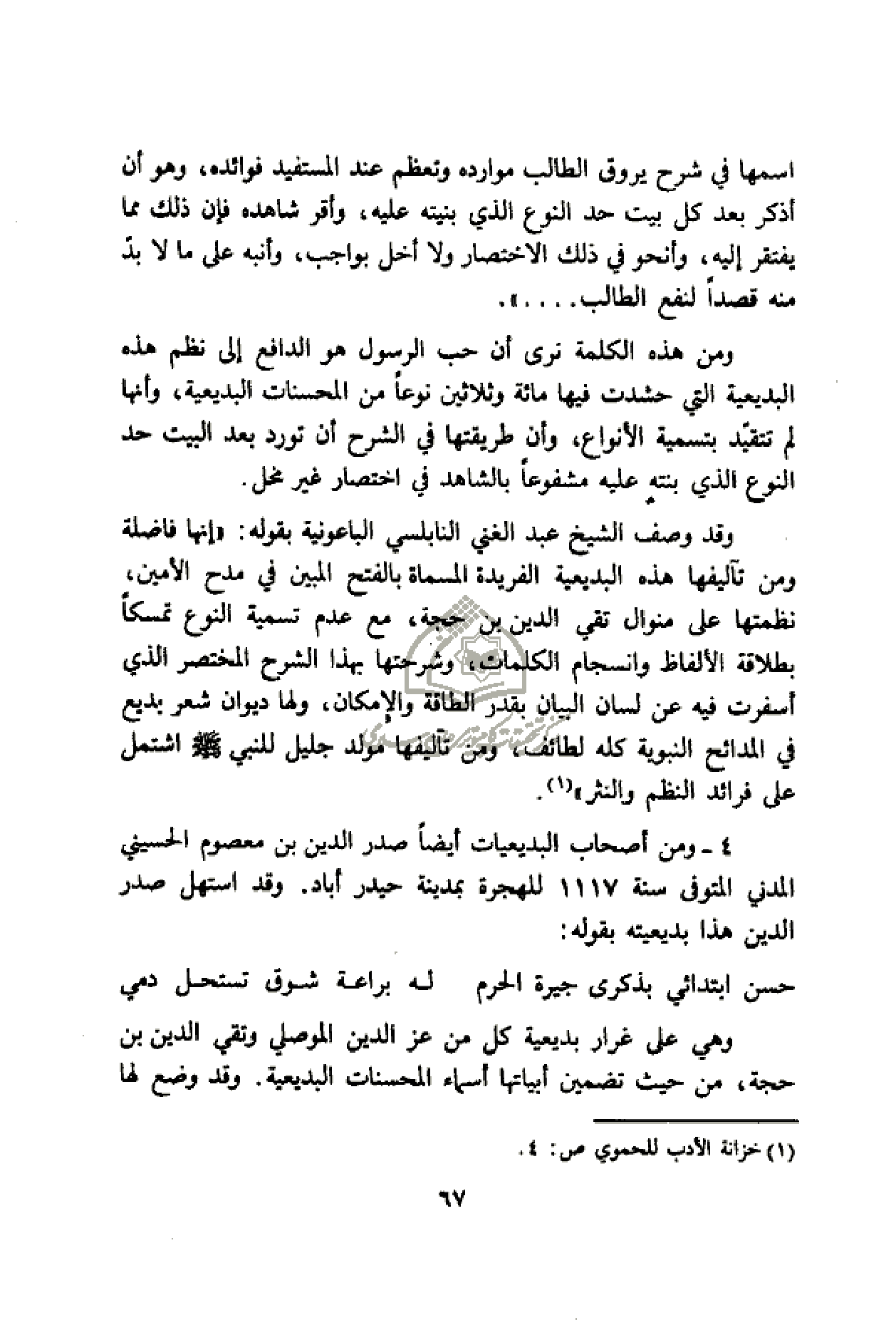 4 - ومن أصحاب البديعيات أيضا صدر الدين بن معصوم الحسيني المدني المتوفى سنة 1117 للهجرة بمدينة حيدر أباد. وقد استهل صدر الدين هذا بديعيته بقوله: