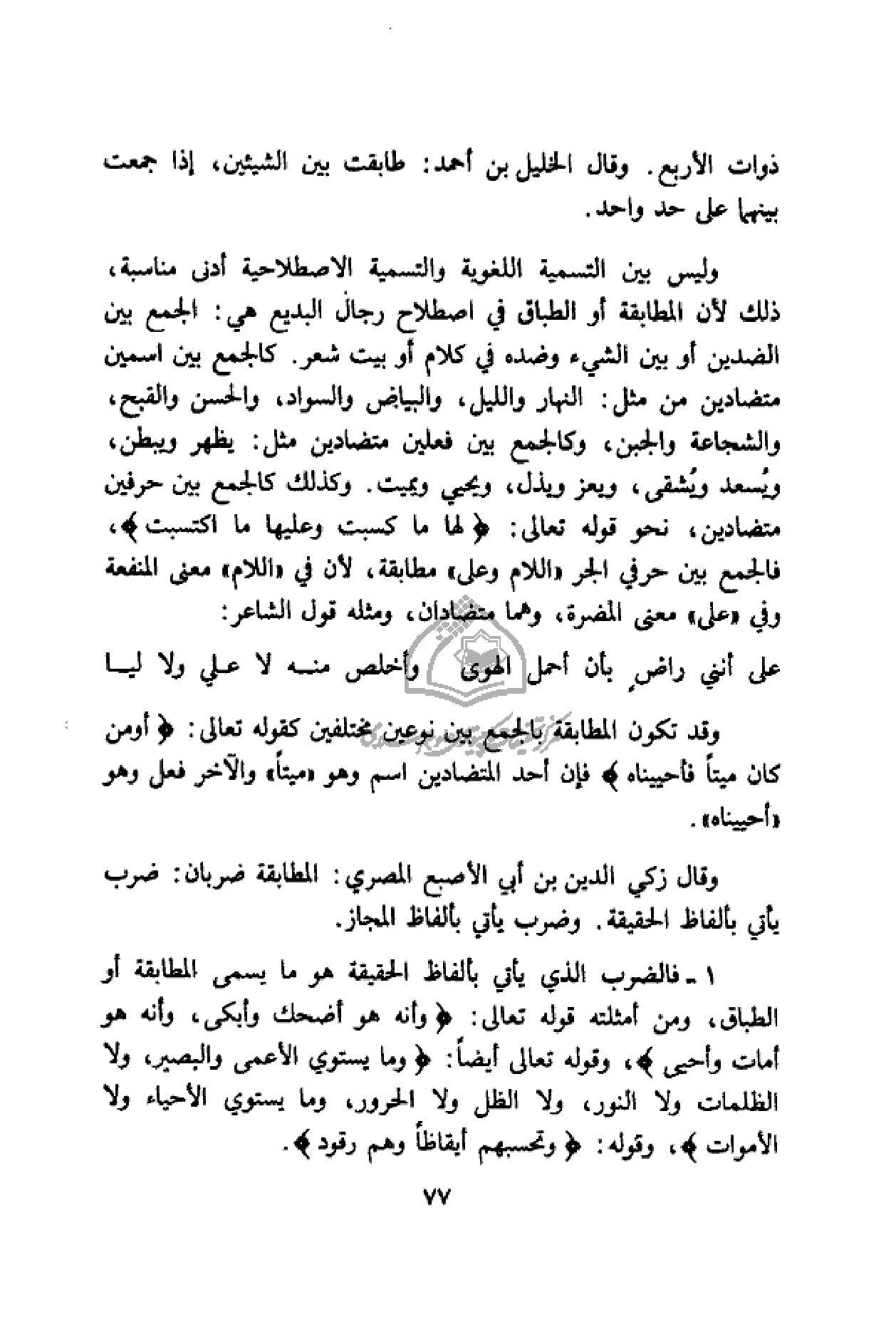 وقال زكي الدين بن أبي الأصبع المصري: المطابقة ضربان: ضرب يأتي بألفاظ الحقيقة. وضرب يأتي بألفاظ المجاز.
