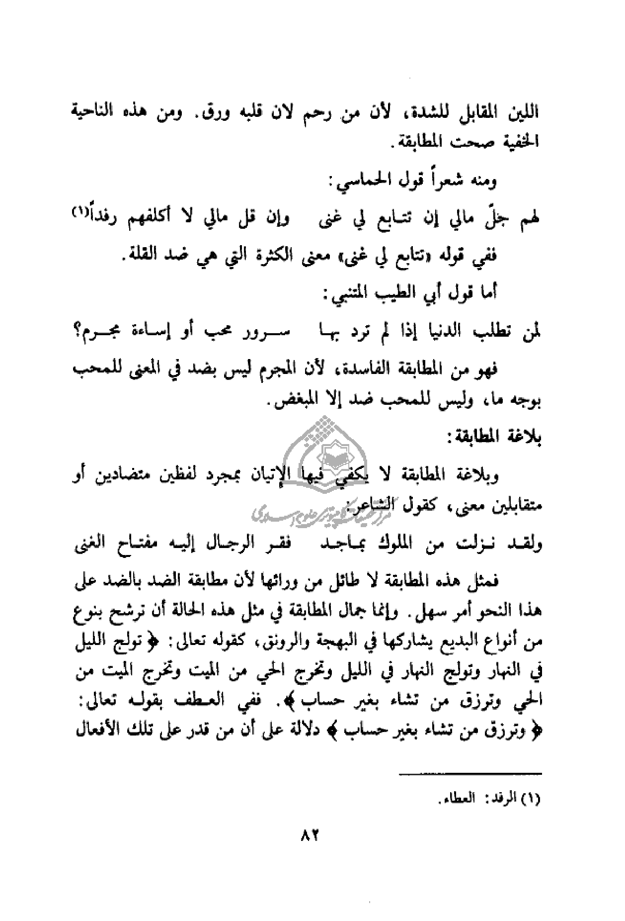 وبلاغة المطابقة لا يكفي فيها الإتيان بمجرد لفظين متضادين أو متقابلين معنى، كقول الشاعر: