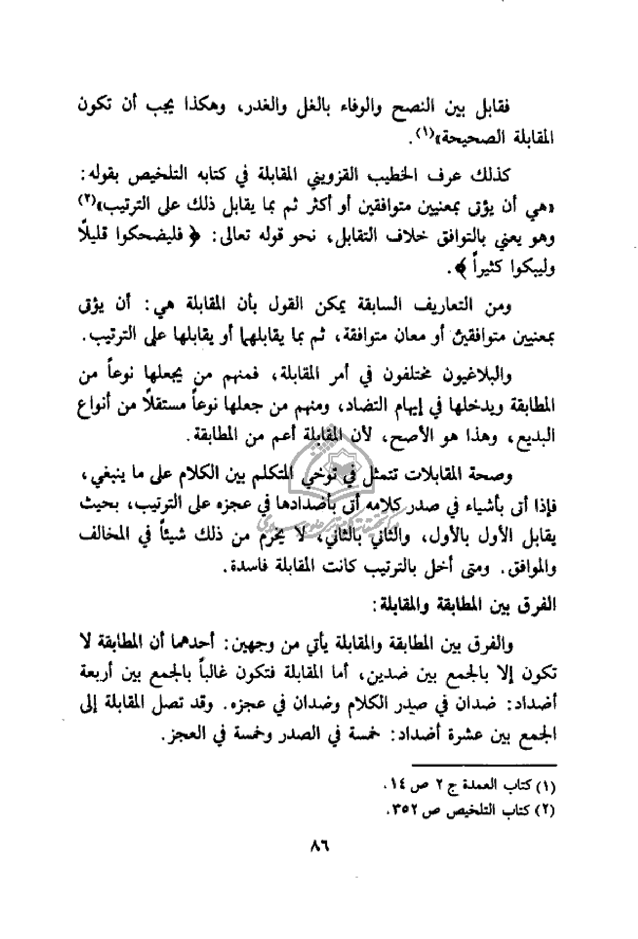 كذلك عرف الخطيب القزويني المقابلة في كتابه التلخيص بقوله:
