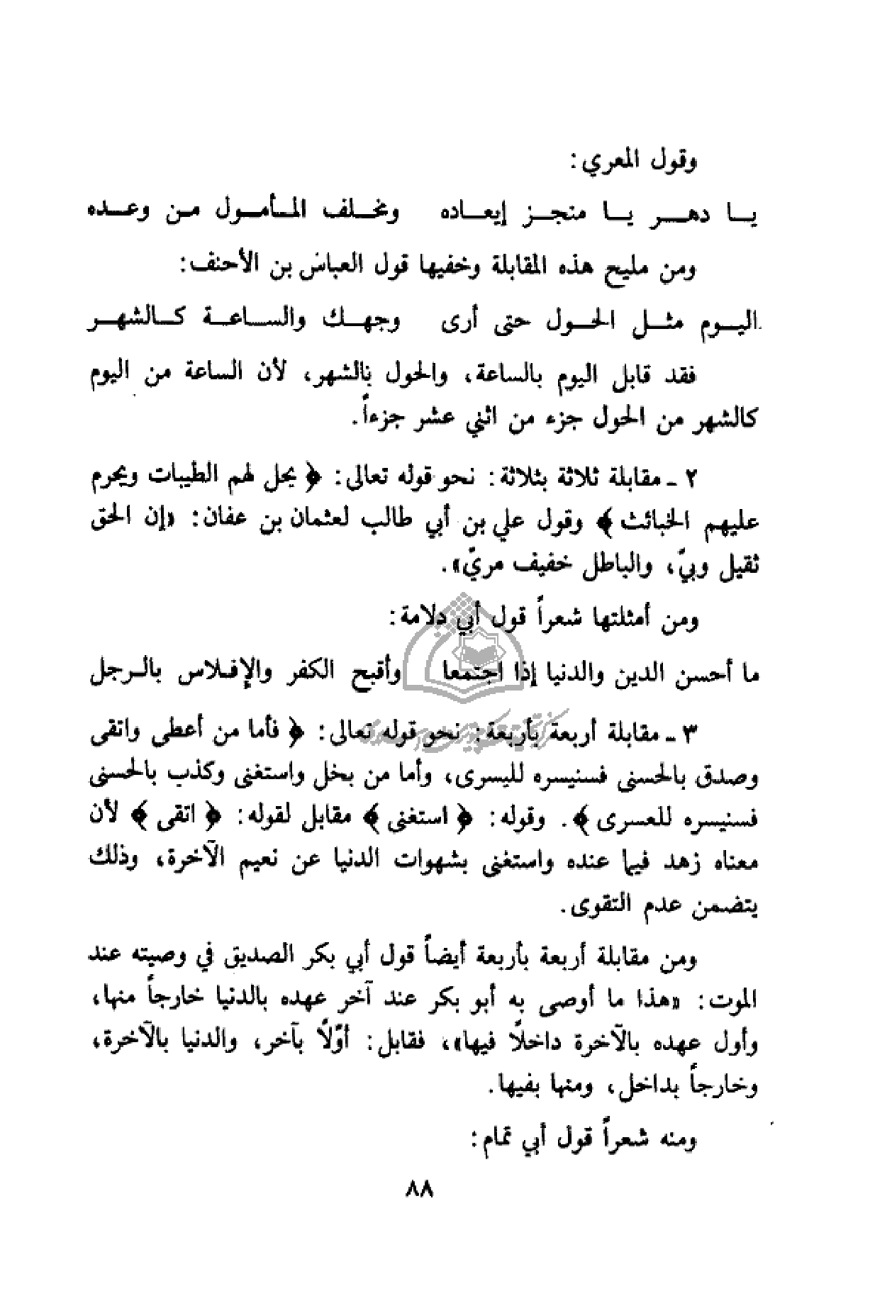 3 - مقابلة أربعة بأربعة: نحو قوله تعالى: فَأَمَّا مَنْ أَعْطى وَاتَّقى وَصَدَّقَ بِالْحُسْنى فَسَنُيَسِّرُهُ لِلْيُسْرى، وَأَمَّا مَنْ بَخِلَ وَاسْتَغْنى وَكَذَّبَ بِالْحُسْنى فَسَنُيَسِّرُهُ لِلْعُسْرى. وقوله: اسْتَغْنى مقابل لقوله: اتَّقى لأن معناه زهد فيما عنده واستغنى بشهوات الدنيا عن نعيم الآخرة، وذلك يتضمن عدم التقوى.