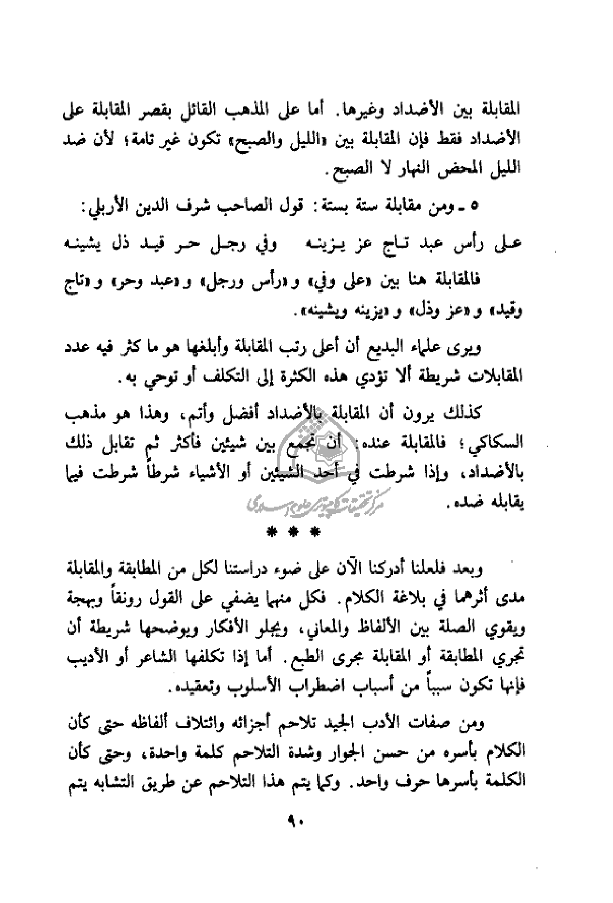 كذلك يرون أن المقابلة بالأضداد أفضل وأتم، وهذا هو مذهب السكاكي؛ فالمقابلة عنده: أن تجمع بين شيئين فأكثر ثم تقابل ذلك بالأضداد، وإذا شرطت في أحد الشيئين أو الأشياء شرطا شرطت فيما يقابله ضده.