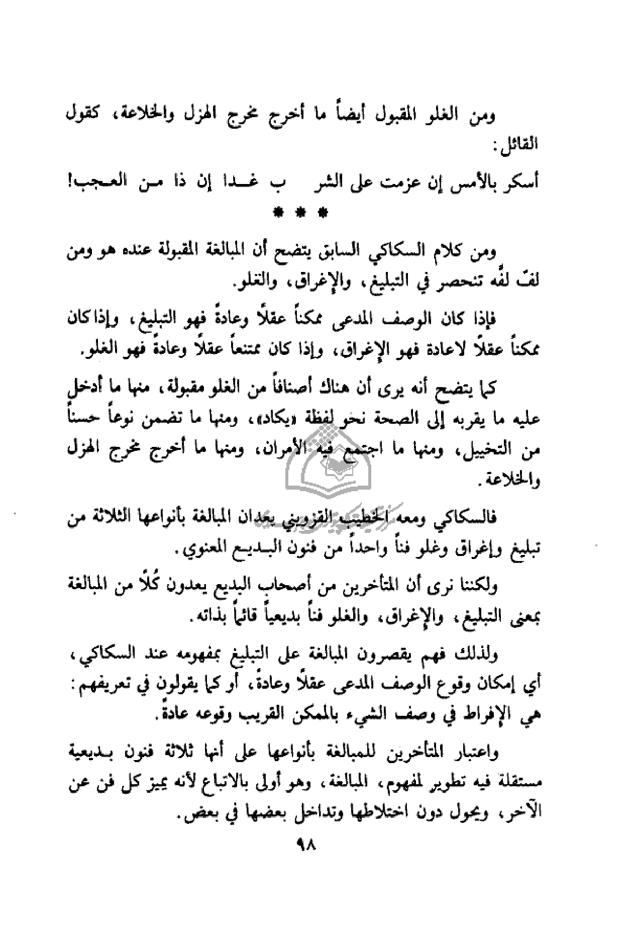 ولذلك فهم يقصرون المبالغة على التبليغ بمفهومه عند السكاكي، أي إمكان وقوع الوصف المدعى عقلا وعادة، أو كما يقولون في تعريفهم: