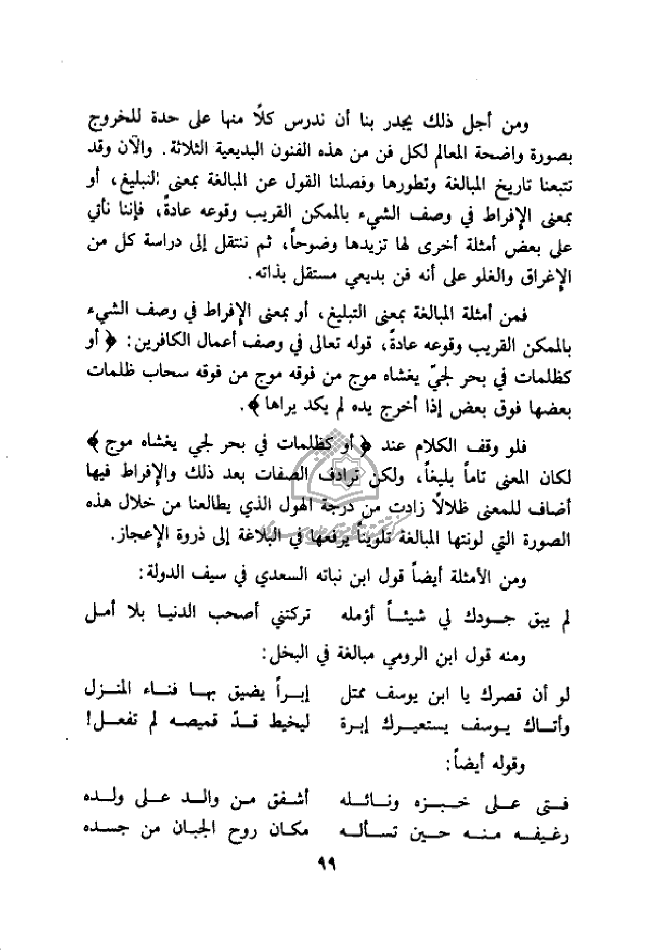 ومن أجل ذلك يجدر بنا أن ندرس كلا منها على حدة للخروج بصورة واضحة المعالم لكل فن من هذه الفنون البديعية الثلاثة. والآن وقد تتبعنا تاريخ المبالغة وتطورها وفصلنا القول عن المبالغة بمعنى التبليغ، أو بمعنى الإفراط في وصف الشيء بالممكن القريب وقوعه عادة، فإننا نأتي على بعض أمثلة أخرى لها تزيدها وضوحا، ثم