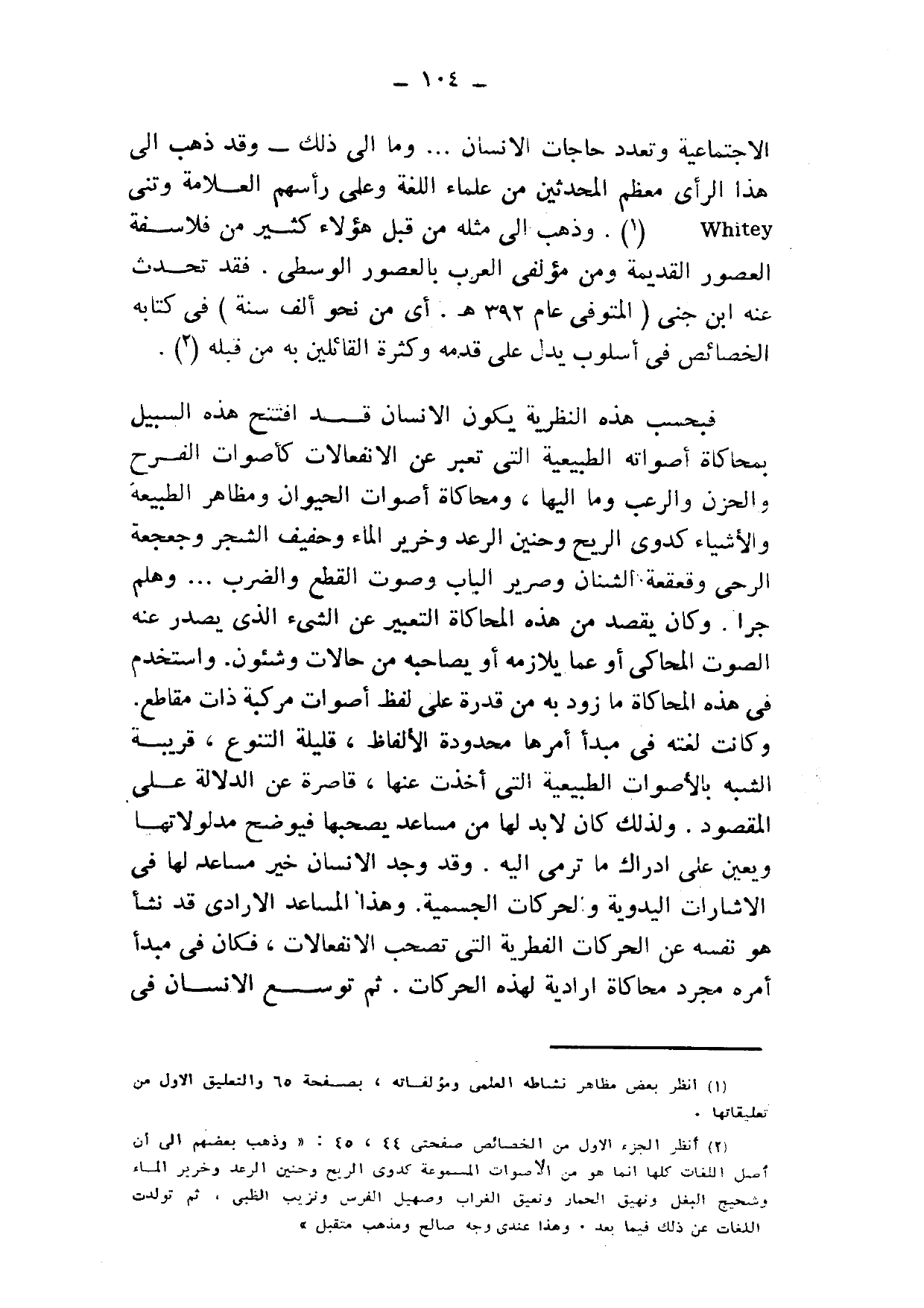 2 انظر الجزء الأول من الخصائص صفحتي 44، 45: "وذهب بعضهم إلى أن أصل اللغات كلها إنما هو من الأصوات المسموعة؛ كدوي الريح, وحنين الرعد, وخرير الماء, وشحيج البغل, ونهيق الحمار, ونعيق الغراب, وصهيل الفرس, ونزيب الظبي، ثم تولدت اللغات عن ذلك فيما بعد, وهذا عندي وجه صالح ومذهب متقبل".