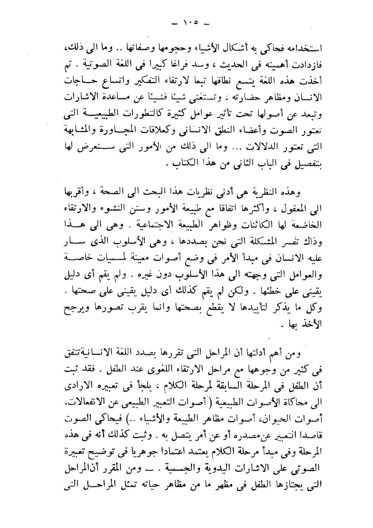 استخدامه؛ فحاكى به أشكال الأشياء وحجومها وصفاتها, وما إلى ذلك، فازدادت أهميته في الحديث، وسد فراغًَا كبيرًا في اللغة الصوتية، ثم أخذت هذه اللغة يتسع نطاقها تبعًا لارتقاء التفكير, واتساع حاجات الإنسان ومظاهر حضارته، وتستغني شيئًا فشيئًا عن مساعدة الإشارات, وتبعد عن أصولها تأثير عوامل كثيرة؛ كالتطورات الطبيعية التي تعتور الصوت وأعضاء النطق الإنساني, وكعلاقات المجاورة والمشابهة التي تعتور الدلالات ... وما إلى ذلك من الأمور التي سنعرض لها بتفصيل في الباب الثاني من هذا الكتاب.