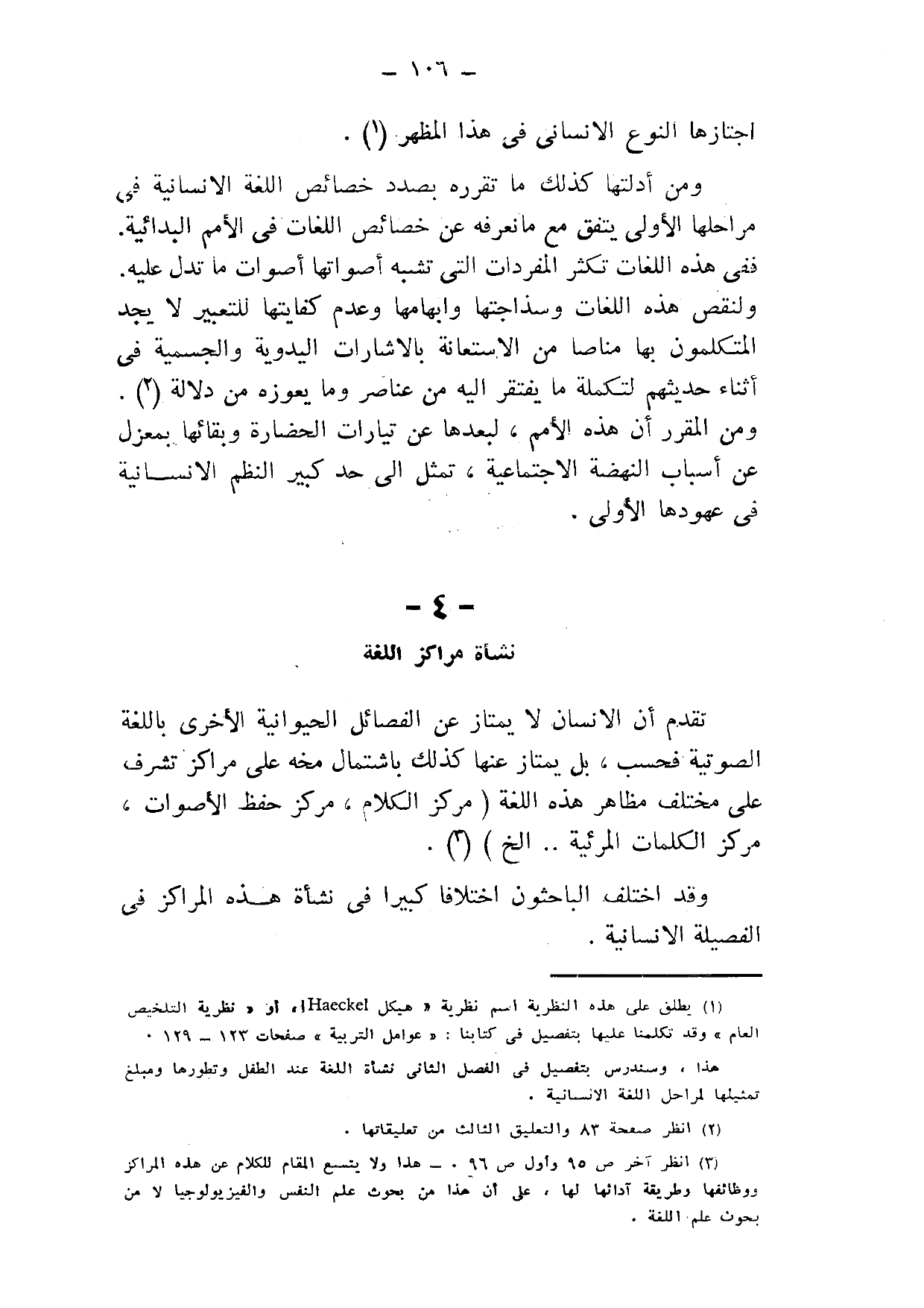 1 انظر آخر ص95 وأول ص96, هذا ولا يتسع المقام للكلام عن هذه المراكز ووظائفها وطريقة آدائها لها، على أن هذا من بحوث علم النفس والفيزيولوجيا لا عن بحوث علم اللغة.