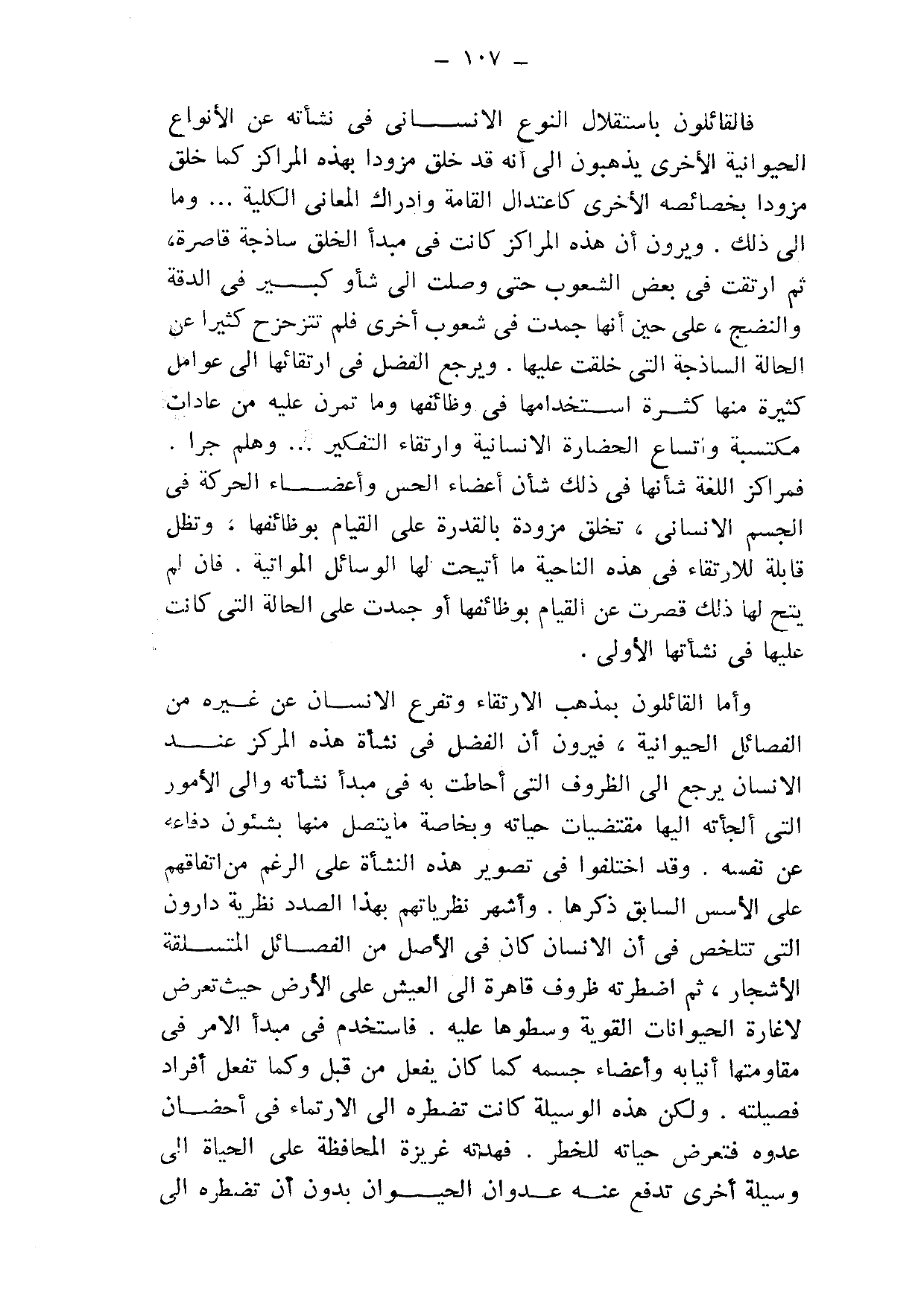 فالقائلون باستقلال النوع الإنساني في نشأته عن الأنواع الحيوانية الأخرى يذهبون إلى أنه قد خلق مزودًا بهذه المراكز, كما خلق مزودًا بخصائصه الأخرى؛ كاعتدال القامة, وإدراك المعاني الكلية ... وما إلى ذلك, ويرون أن هذه المراكز كانت في مبدأ الخلق ساذجة قاصرة، ثم ارتقت في بعض الشعوب حتى وصلت إلى شأوٍ كبير في الدقة والنضج، على حين أنها جمدت في شعوب أخرى فلم تتزحزج كثيرًا عن الحالة الساذجة التي خلقت عليها, ويرجع الفضل في ارتقائها إلى عوامل كثيرة؛ منها كثرة استخدامها في وظائفها, وما تمرن عليه من عادات مكتسبة, واتساع الحضارة الإنسانية, وارتقاء التفكير ... وهلم جرا.