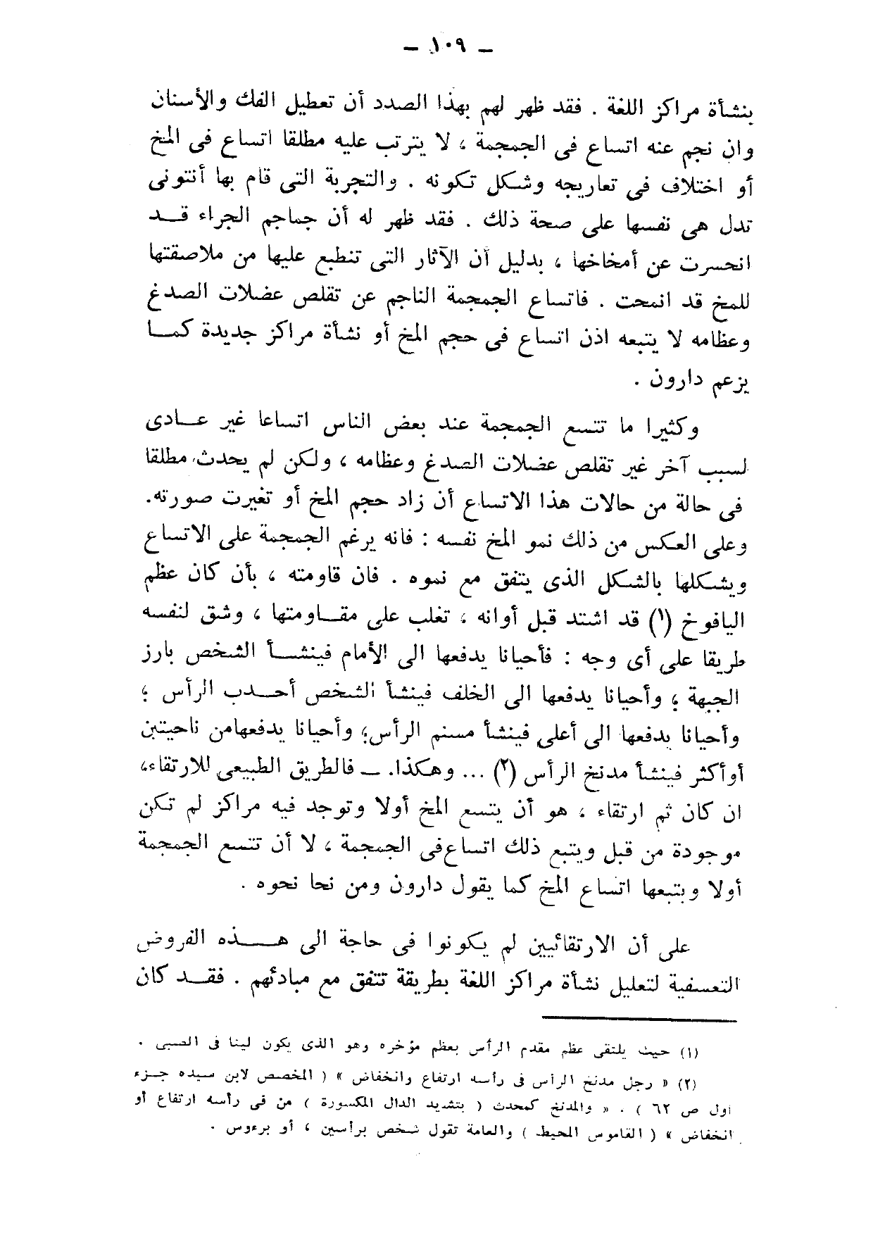 وكثيرًا ما تتسع الجمجمة عند بعض الناس اتساعًا غير عاديّ لسبب آخر غير تقلص عضلات الصدغ وعظامه، ولكن لم يحدث مطلقًا في حالة من حالات هذا الاتساع أن زاد حجم المخ أو تغيرت صورته. وعلى العكس من ذلك نمو المخ نفسه؛ فإنه يرغم الجمجمة على الاتساع, ويشكلها بالشكل الذي يتفق مع نموه, فإن قاومته، بأن كان عظم اليافوخ1 قد اشتد قبل أوانه، تغلب على مقاومتها وشق لنفسه طريقًا على أي وجه, فأحيانًا يدفعها إلى الأمام فينشأ الشخص بارز الجبهة، وأحيانًا يدفعها إلى الخلف فينشأ الشخص أحدب الرأس، وأحيانًا يدفعها إلى أعلى فينشأ مسنم الرأس، وأحيانًا يدفعها من ناحيتين أو أكثر فينشأ مدنخ الرأس2 ... وهكذا, فالطريق الطبيعي للارتقاء، إن كان ثَمَّ ارتقاء، هو أن يتسع المخ أولًا وتوجد فيه مراكز لم تكن موجودة من قبل, ويتبع ذلك اتساع في الجمجمة، لا أن تتسع الجمجمة أولًا ويتبعها اتساع المخ كما يقول دارون ومن نحا نحوه.