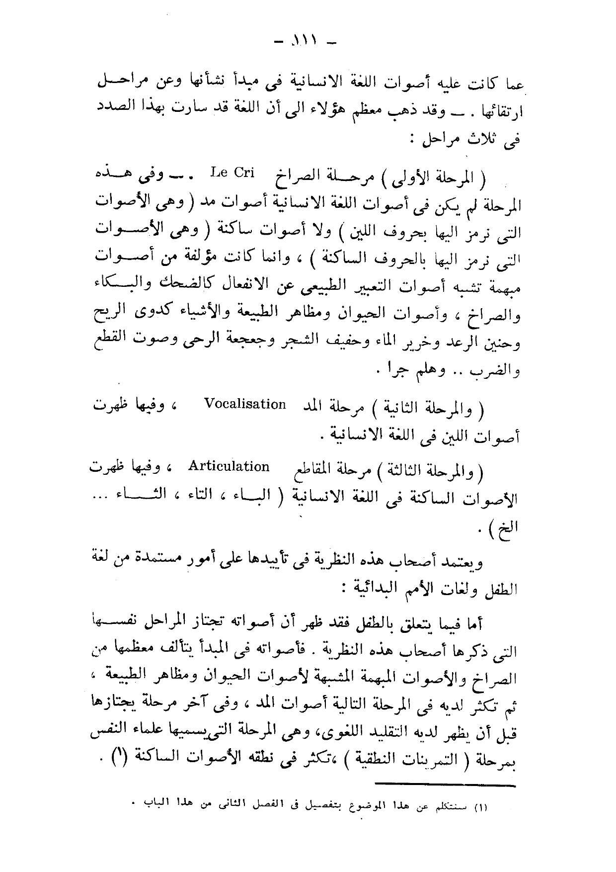 عما كانت عليه أصوات اللغة الإنسانية في مبدأ نشأتها, وعن مراحل ارتقائها, وقد ذهب معظم هؤلاء إلى أن اللغة قد سارت بهذا الصدد في ثلاث مراحل: