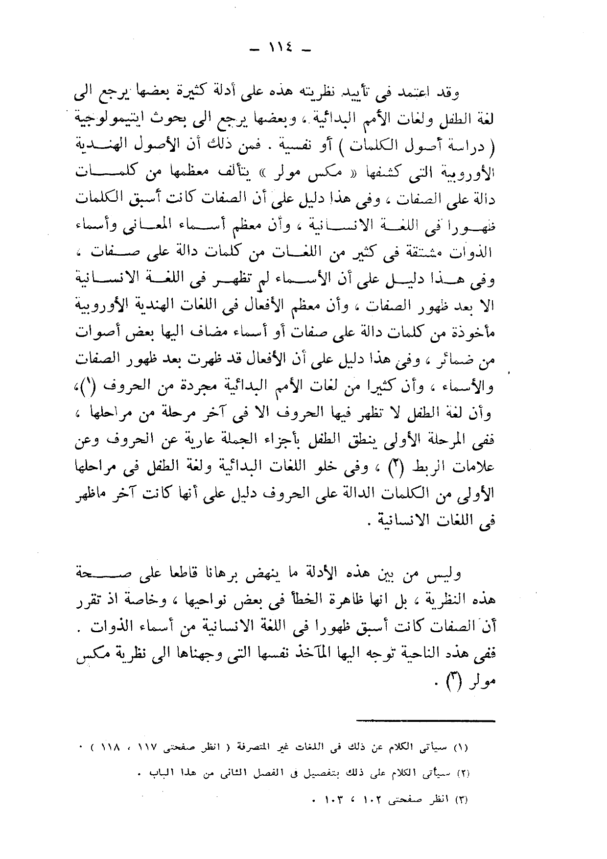 وليس من بين هذه الأدلة ما ينهض برهانًا قاطعًا على صحة هذه النظرية، بل إنها ظاهرة الخطأ في بعض نواحيها، وخاصة إذ تقرر أن الصفات كانت أسبق ظهورًا في اللغة الإنسانية من أسماء الذوات, ففي هذه الناحية توجه إليها المآخذ نفسها التي وجهناها إلى نظرية مكس مولر3.