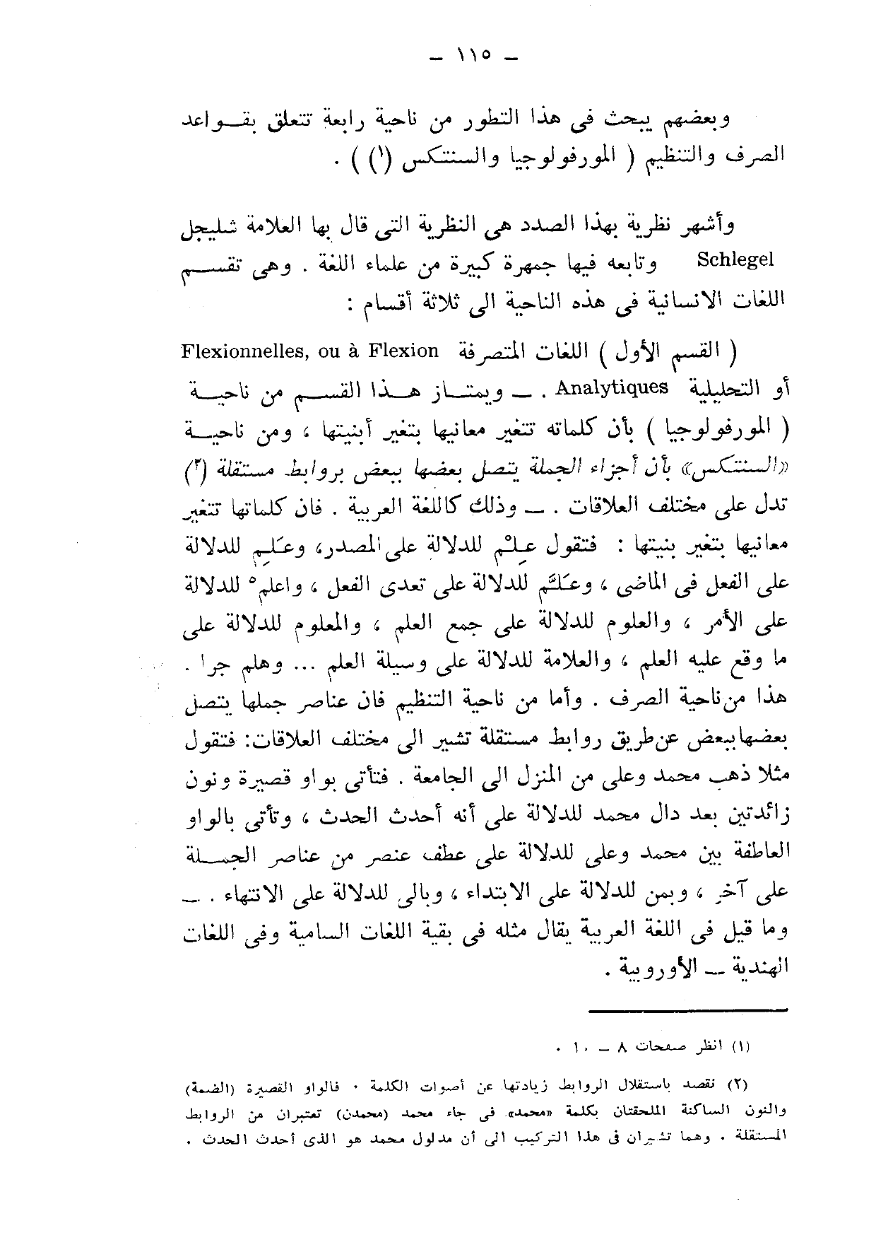 القسم الأول: اللغات المتصرفة Flexionnelles ou a Flexion, أو التحليلة Analytiquew: ويمتاز هذ االقسم من ناحية "المورفولوجيا" بأن كلماته تتغير معانيها بتغير أبنيتها، ومن ناحية "السنتكس" بأن أجزاء الجملة يتصل بعضها ببعض بروابط مستقلة2 تدل على مختلف العلاقات, وذلك كاللغة العربية؛ فإن كلماتها تتغير معانيها بتغير بنيتها؛ فتقول عِلْم للدلالة على المصدر، وعَلِمَ للدلالة على الفعل الماضي، وعَلَّمَ للدلالة على تعدي الفعل، واعْلَمْ للدلالة على الأمر، والعلوم للدلالة على جمع العلم، والمعلوم للدلالة على ما وقع عليه العلم، والعلَّامة للدلالة على وسيلة العلم ... وهلم جرا. هذا من ناحية الصرف, وأما من ناحية التنظيم: فإن عناصر جملها يتصل بعضها ببعض عن طريق روابط مستقلة تشير إلى مختلف العلاقات؛ فتقول مثلًا: ذهب محمد وعلي من المنزل إلى الجامعة, فتأتي بواو قصيرة ونون زائدتين بعد دال محمد للدلالة على أنه أحدث الحدث، وتأتي بالواو العاطفة بين محمد وعلي للدلالة على عطف عنصر من عناصر الجملة على آخر، وبمن للدلالة على الابتداء، وبإلي للدلالة على الانتهاء, وما قيل في اللغة العربية يقال مثله في بقية اللغات السامية, وفي اللغات الهندية - الأوروبية.