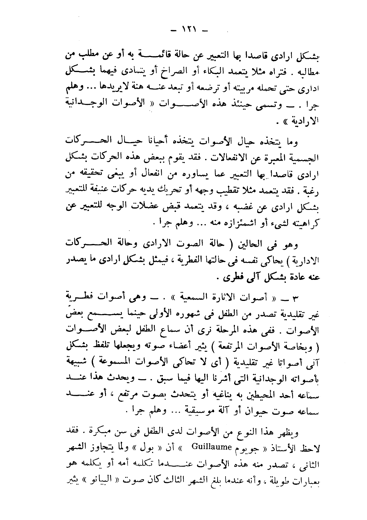 بشكل إرادي قاصدًا بها التعبير عن حالة قائمة به, أو عن مطلب من مطالبه، فتراه مثلًا يتعمد البكاء أو الصراخ، أو يتمادى فيهما بشكل إرادي حتى تحمله مربيته أو ترضعه أو تبعد عنه هنة لا يريدها ... وهلم جرا. وتسمى حينئذ هذه الأصوات "الأصوات الوجدانية الإرادية".