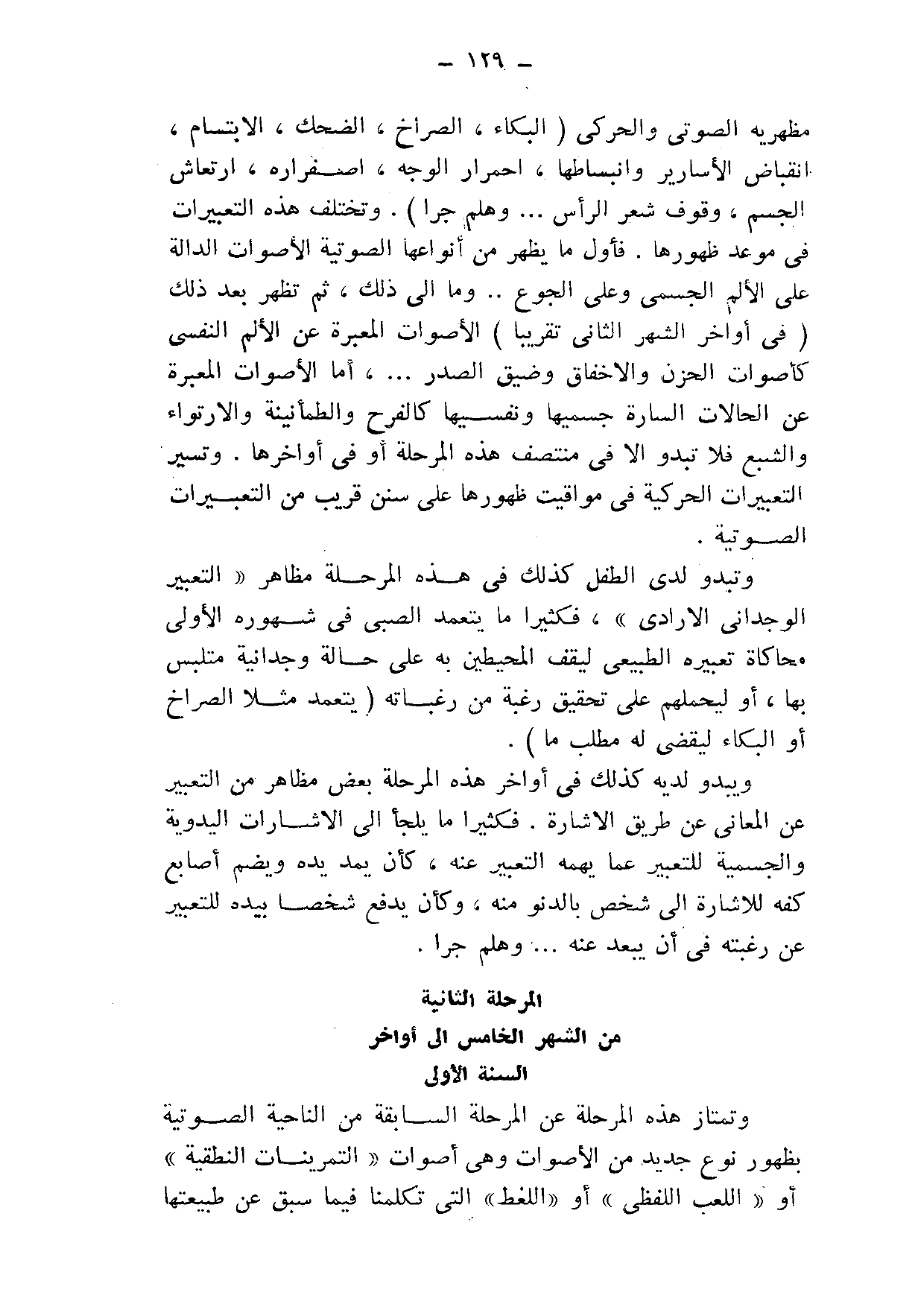 ويبدو لديه كذلك في أواخر هذه المرحلة بعض مظاهر من التعبير عن المعاني عن طريق الإشارة؛ فكثيرًا ما يلجأ إلى الإشارات اليدوية والجسمية للتعبير عما يهمه التعبير عنه، كأن يمد يده ويضم أصابع كفه للإشارة إلى شخص بالدنو منه، وكأن يدفع شخصًا بيده للتعبير عن رغبته في أن يبعد عنه ... وهلم جرا.