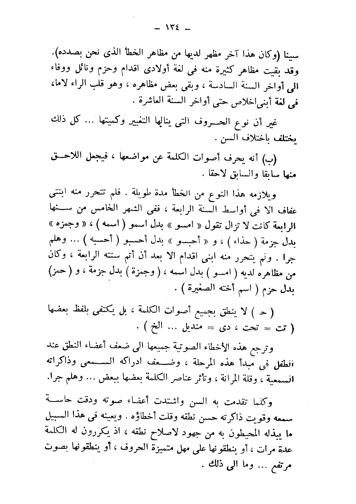 سينًا -وكان هذا آخر مظهر لديها من مظاهر الخطأ الذي نحن بصدده. وقد بقيت مظاهر كثيرة منه في لغة أولادي إقدام وحزم ونائل ووفاء إلى أواخر السنة السادسة، وبقي بعض مظاهره، وهو قلب الراء لامًا، في لغة ابني إخلاص حتى أواخر السنة العاشرة.