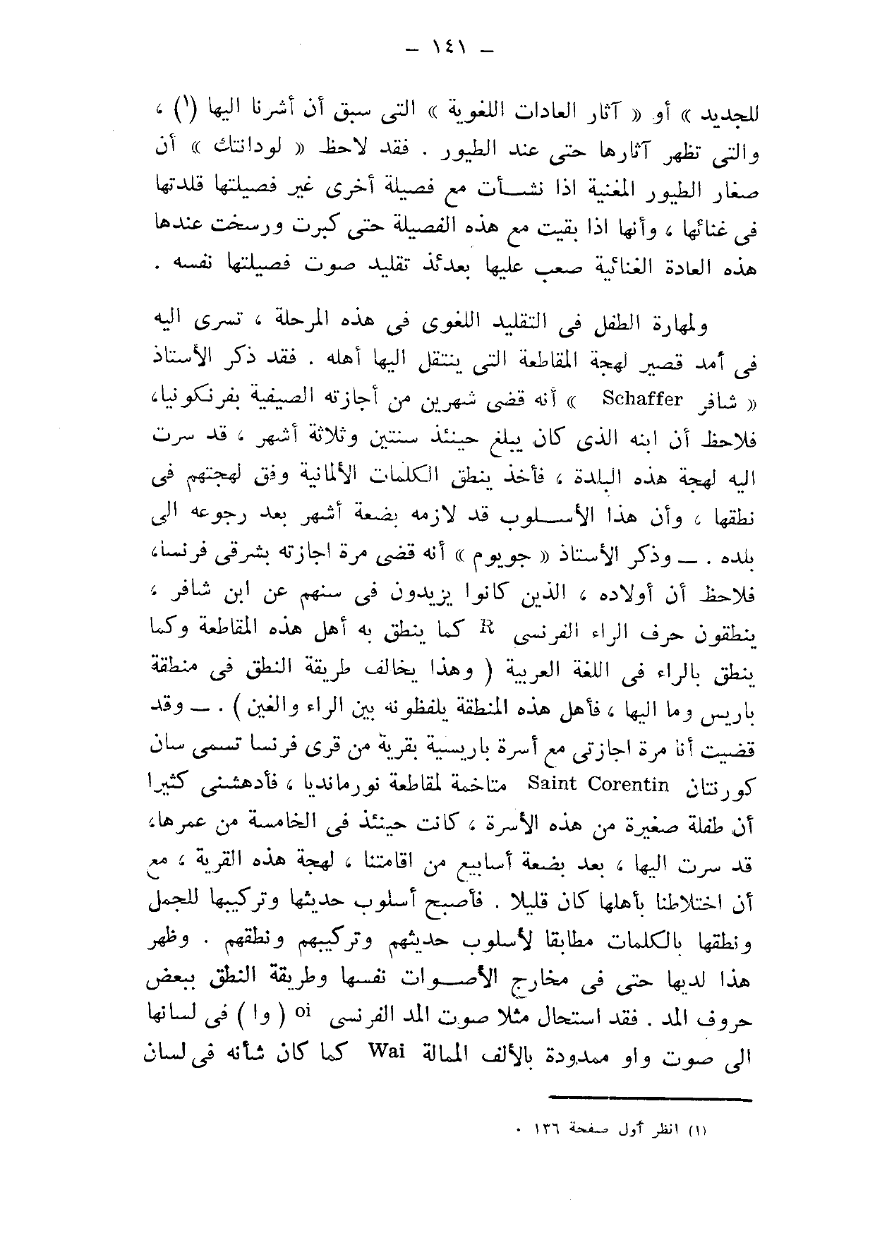 ولمهارة الطفل في التقليد اللغوي في هذه المرحلة، تسري إليه في أمد قصير لهجة المقاطعة التي ينتقل إليها أهله؛ فقد ذكر الأستاذ "شافر Schaffer" أنه قضى شهرين من إجازته الصيفية بفرنكونيا، فلاحظ أن ابنه الذي كان يبلغ حينئذ سنتين وثلاثة أشهر، قد سرت إليه لهجة هذه البلدة، ينطق الكلمات الألمانية وفق لهجتهم في نطقها، وأن هذا الأسلوب قد لازمه بضعة أشهر بعد رجوعه إلى بلده, وذكر الأستاذ "جويوم" أنه قضى مرة إجازته بشرقي فرنسا، فلاحظ أن أولاده، الذين كانوا يزيدون في سنهم عن ابن شافر، ينطقون حرف الراء الفرنسي R, كما ينطق به أهل هذه المقاطعة, وكما ينطق بالراء في اللغة العربية "وهذا يخالف طريقة النطق في منطقة باريس ما إليها، فأهل هذه المنطقة يلفظونه بين الراء والغين", وقد قضيت أنا مرة إجازتي مع أسرة باريسية بقرية من قرى فرنسا تسمى: سان كورنتان Saint Corintin, متاخمة لمقاطعة نورمانديا، فأدهشني كثيرًا أن طفلة صغيرة من هذه الأسرة، كانت حينئذ في الخامسة من عمرها، قد سرت إليها، بعد بضعة أسابيع من إقامتنا، لهجة هذه القرية، مع أن اختلاطنا بأهلها كان قليلًا, فأصبح أسلوب حديثها وتركيبها للجمل, ونطقها بالكلمات مطابقًا لأسلوب حديثهم وتركيبهم ونطقهم, وظهر هذا لديها حتى في مخارج الأصوات نفسها, وطريقة النطق ببعض حروف المد, فقد استحال مثلًا صوت المد الفرنسي oi "وا" في لسانها إلى صوت واو ممدودة بالألف الممالة Wai, كما كان شأنه في لسان