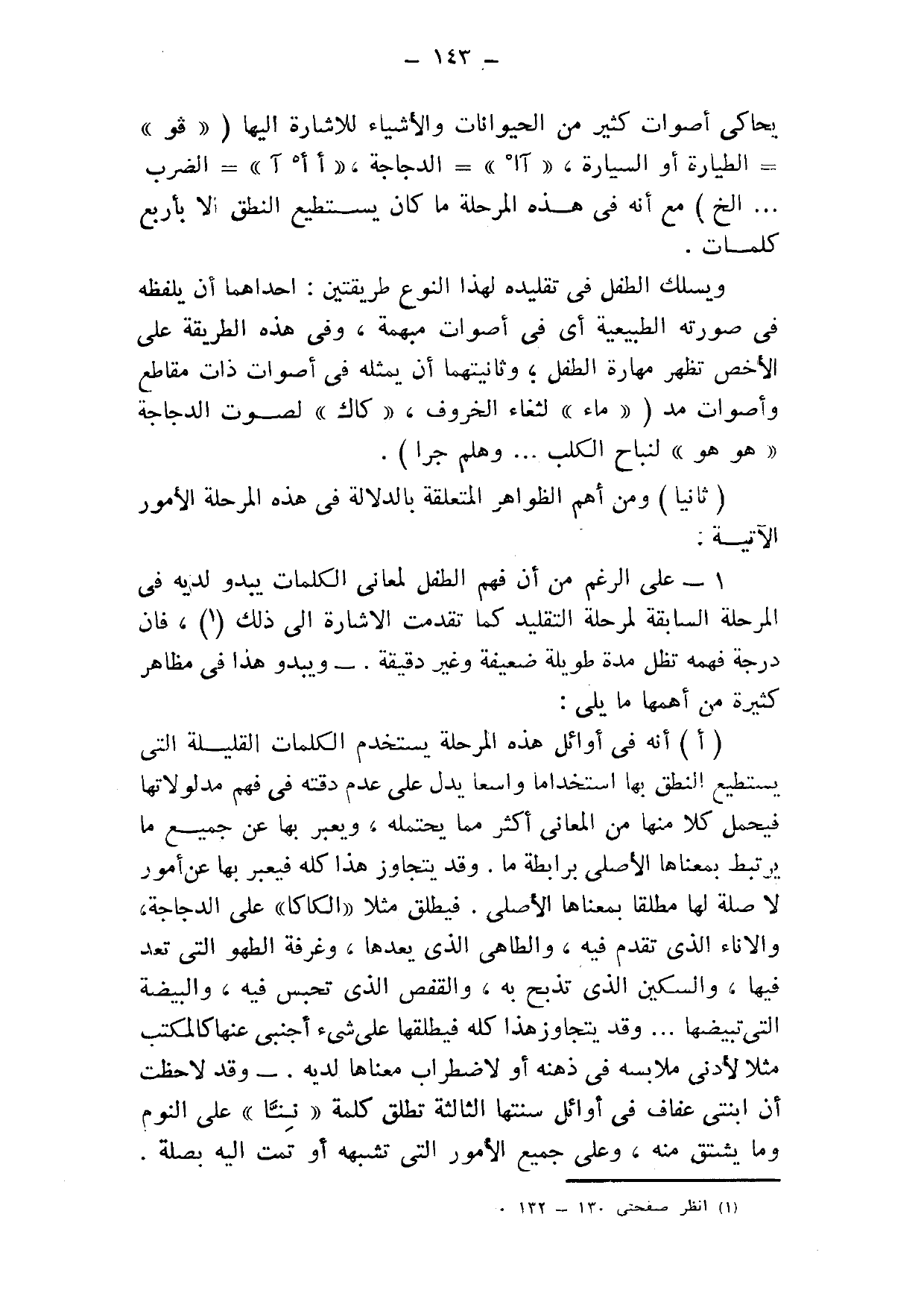 أ- أنه في أوائل هذه المرحلة يستخدم الكلمات القليلة التي يستطيع النطق بها استخدامًا واسعًا, يدل على عدم دقته في فهم مدلولاتها, فيحمل كلًّا منها من المعاني أكثر مما يحتمله، ويعبر بها عن جميع ما يرتبط بمعناها الأصلي برابطة ما, وقد يتجاوز هذا كله فيعبر بها عن أمور لا صلة لها مطلقًا بمعناها الأصلي؛ فيطلق مثلًا "الكاكا" على الدجاجة، والإناء الذي تقدم فيه، والطاهي الذي يعدها، وغرفة الطهو التي تعد فيها، والسكين الذي تذبح به، والقفص الذي تحبس فيه، والبيضة التي تبيضها ... وقد يتجاوز هذا كله فيطلقها على شيء أجنبي عنها؛ كالمكتب مثلًا, لأدنى ملابسة في ذهنه, أو لاضطراب معناها لديه, وقد لاحظت أن ابنتي عفاف في أوائل سنتها الثالثة تطلق كلمة "ننا" على النوم وما يشتق منه، وعلى جميع الأمور التي تشبهه أو تمت إليه بصلة.