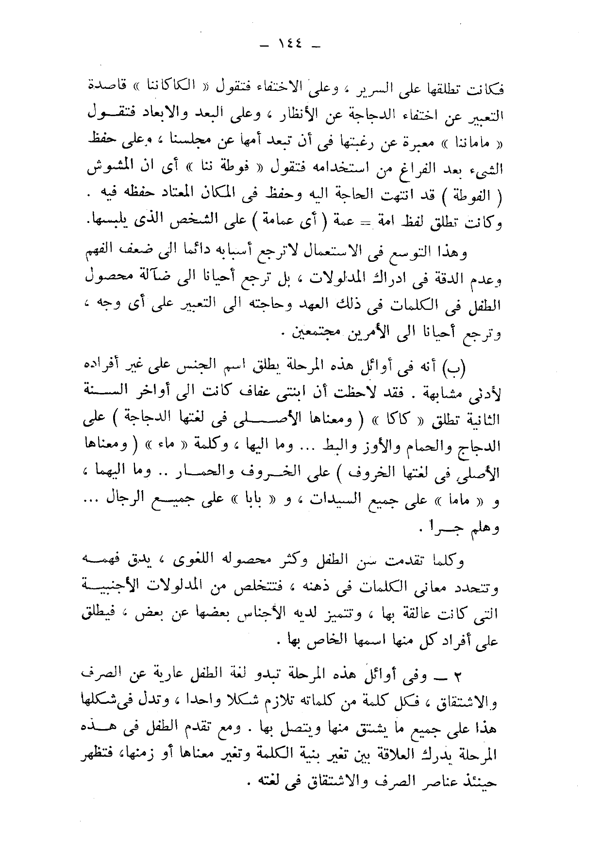 ب- أنه في أوائل هذه المرحلة يطلق اسم الجنس على غير أفراده لأدنى مشابهة؛ فقد لاحظت أن ابنتي عفاف كانت إلى أواخر السنة الثانية تطلق "كاكا" "ومعناها الأصلي في لغتها الدجاجة" على الدجاج والحمام والأوز والبط ... وما إليها، وكلمة "ماء" "ومعناها الأصلي في لغتها الخروف" على الخروف والحمار.. وما إليها، و"ماما" على جميع السيدات، و"بابا" على جميع الرجال ... وهلم جرا.