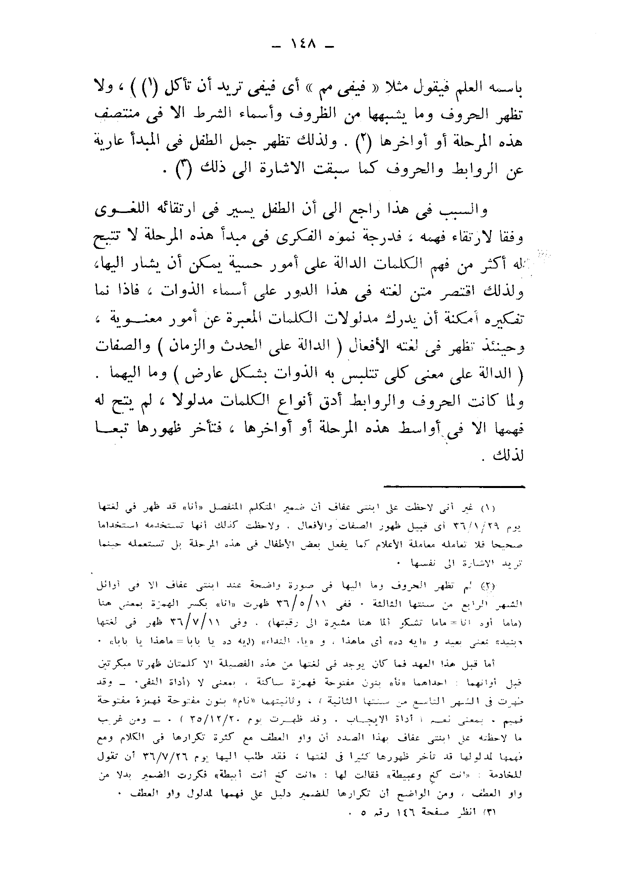 2 لم تظهر الحروف وما إليها في صورة واضحة عند ابنتي عفاف إلّا في أوائل الشهر الرابع من سنتها الثالثة, ففي 11/ 5/ 36 ظهرت "إنا" بكسر الهمزة بمعنى هنا "ماما أوه أنا= ماما تشكو ألما هنا, مشيرة إلى رقبتها". وفي 11/ 7/ 36 ظهر في لغتها "بنيد" بمعنى بعيد, و"إيه ده" أي: ما هذا, و"يا، النداء", "أيه ده يا بابا= ما هذا يا بابا".