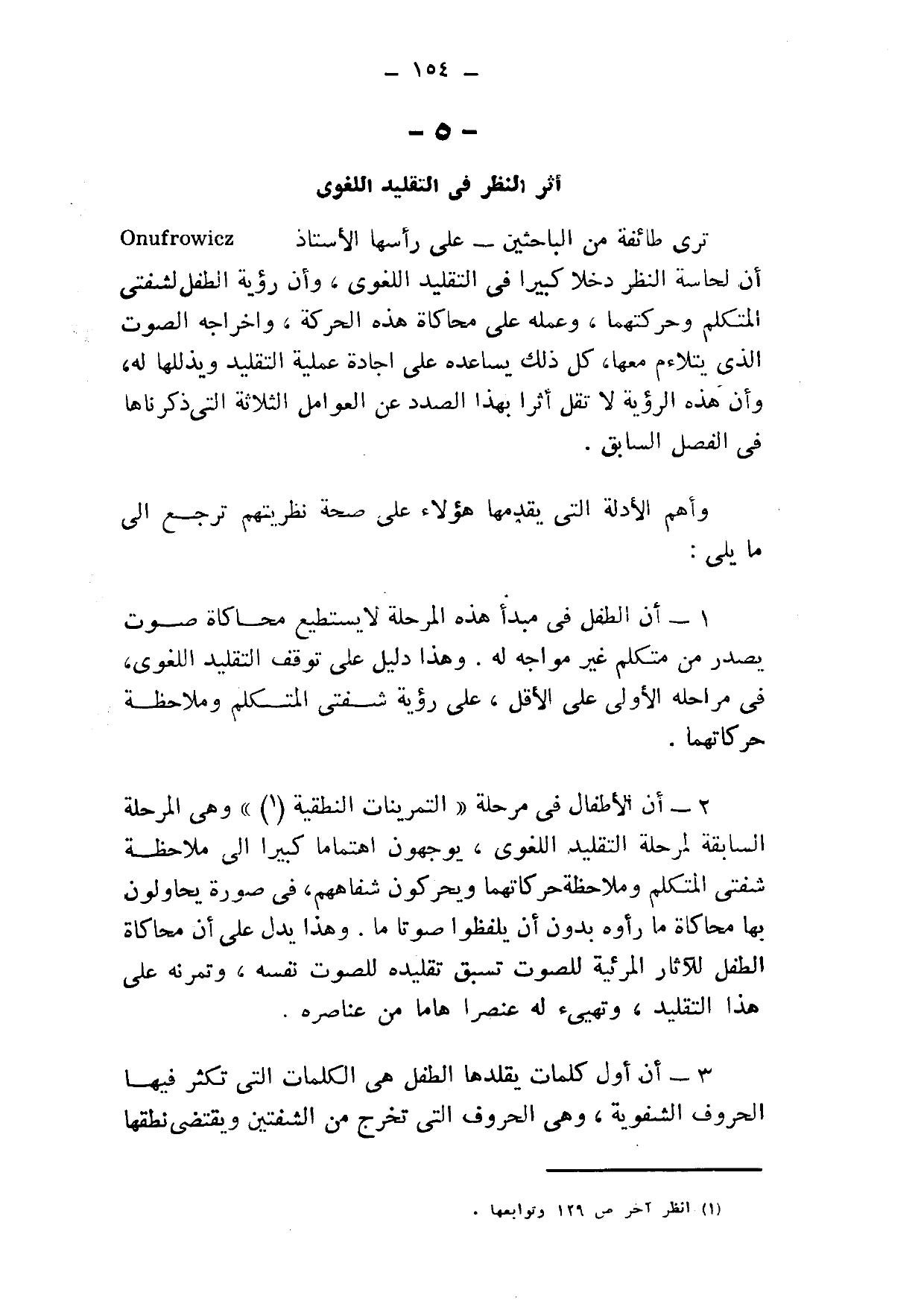 ترى طائفة من الباحثين -على رأسها الأستاذ Onufrowicz- أن لحاسة النظر دخلًا كبيرًا في التقليد اللغوي، وأن رؤية الطفل لشفتي المتكلم وحركتهما، وعمله على محاكاة هذه الحركة، وإخراجه الصوت الذي يتلاءم معها، كل ذلك يساعده على إجادة عملية التقليد ويذللها له، وأن هذه الرؤية لا تقل أثرًا بهذا الصدد عن العوامل الثلاثة التي ذكرناها في الفصل السابق.