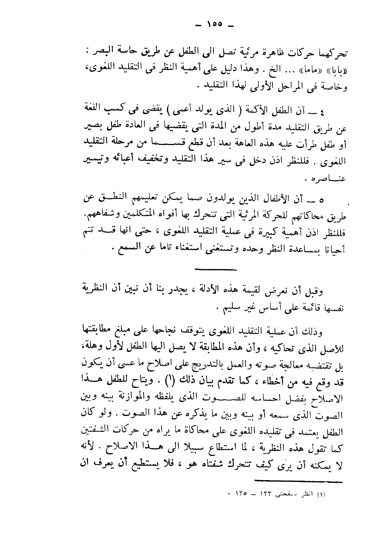 وذلك أن عملية التقليد اللغوي يتوقف نجاحها على مبلغ مطابقتها للأصل الذي تحاكيه، وأن هذه المطابقة لا يصل إليها الطفل لأول وهلة، قد تقتضيه معالجة صوته, والعمل بالتدريج على إصلاح ما عسى أن يكون قد وقع فيه من أخطاء، كما تقدم بيان ذلك1. ويتاح للطفل هذا الإصلاح بفضل إحساسه للصوت الذي يلفظه, والموازنة بينه وبين الصوت الذي سمعه, أو بينه وبين ما يذكره عن هذا الصوت. ولو كان الطفل يعتمد في تقليده اللغوي على محاكاة ما يراه من حركات الشفتين كما تقول هذه النظرية، لما استطاع سبيلًا إلى هذا الإصلاح؛ لأنه لا يمكنه أن يرى كيف تتحرك شفتاه هو، فلا يستطيع أن يعرف أن