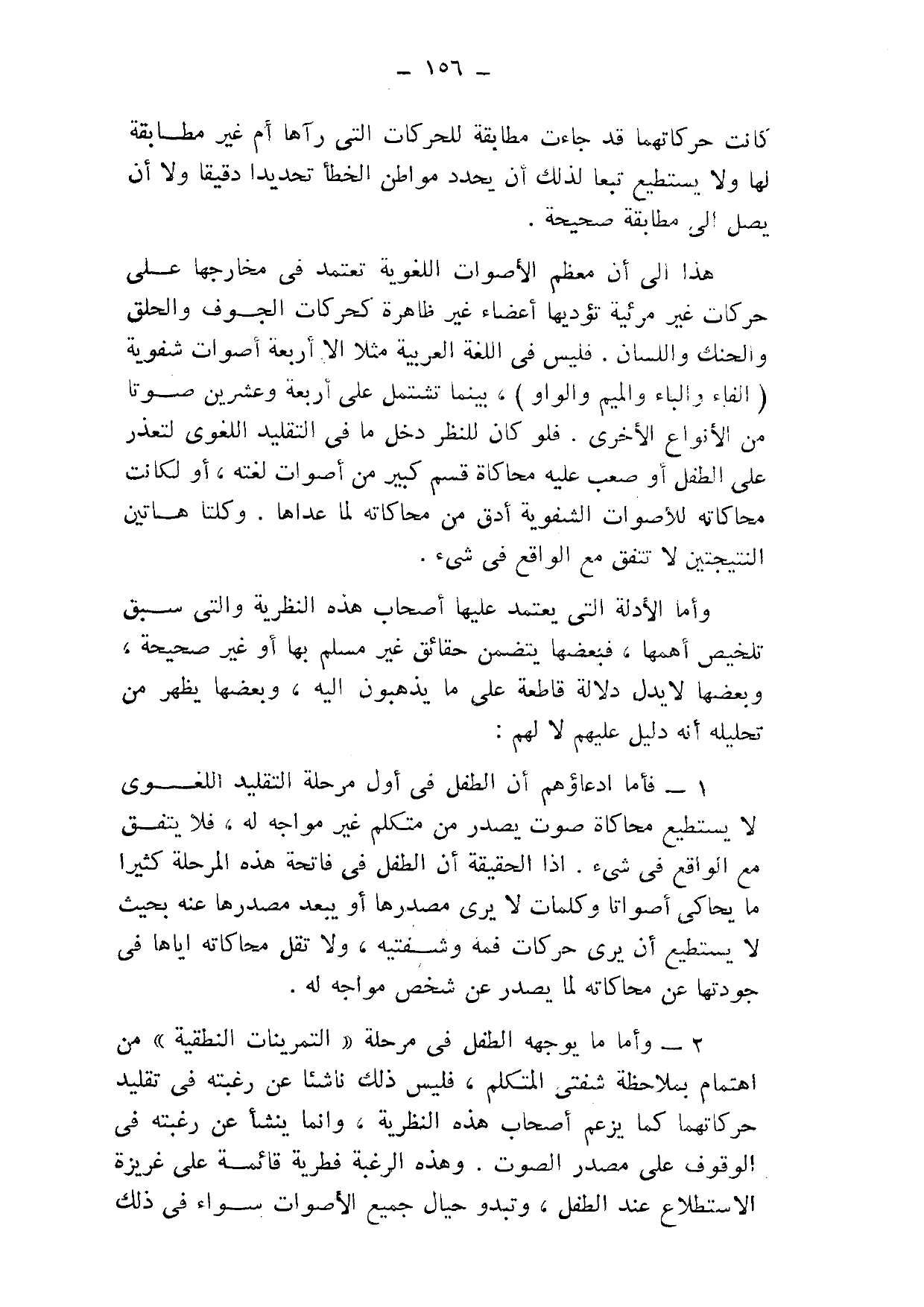 2- وأما ما يوجهه الطفل في مرحلة "التمرينات النطقية" من اهتمام بملاحظة شفتي الكلام، فليس ذلك ناشئًا عن رغبته في تقليد حركاتهما كما يزعم أصحاب هذه النظرية، وإنما ينشأ عن رغبته في الوقوف على مصدر الصوت, وهذه الرغبة فطرية قائمة على غريزة الاستطلاع عند الطفل، وتبدو حيال جميع الأصوات سواء في ذلك