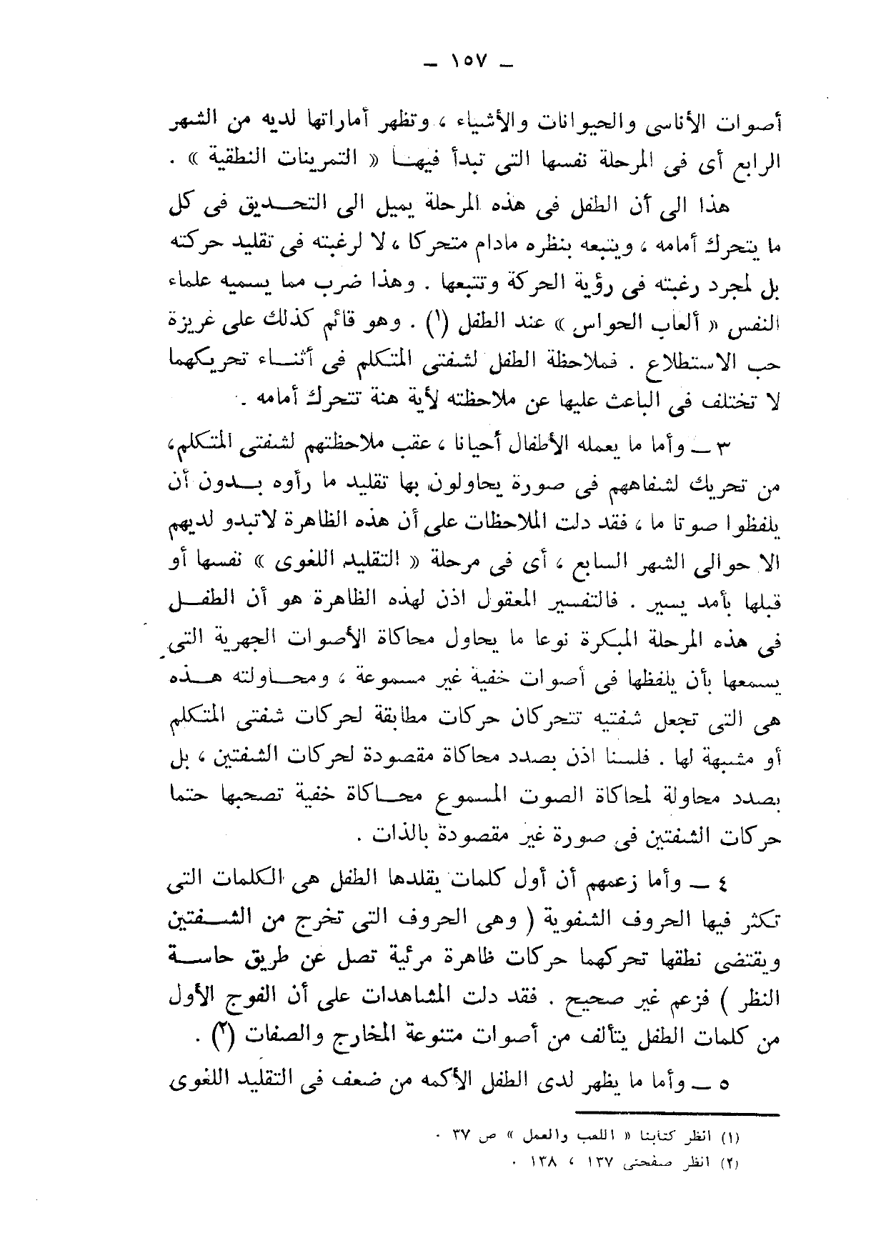 3- وأما ما يعمله الأطفال أحيانًا، عقب ملاحظتهم لشتفي المتكلم، من تحريك لشفاهم في صورة يحاولون بها تقليد ما رأوه بدون أن يلفظوا صوتًا ما، فقد دلَّت الملاحظات على أن هذه الظاهرة لا تبدو لديهم إلّا حوالي الشهر السابع، أي: في مرحلة "التقليد اللغوي" نفسها, أو قبلها بأمد يسير؛ فالتفسير المعقول إذن لهذه الظاهرة: هو أن الطفل في هذه المرحلة المبكرة نوعًا ما يحاول محاكاة الأصوات الجهرية التي يسمعها بأن يلفظها في أصوات خفية غير مسموعة، ومحاولته هذه هي التي تجعل شفتيه تتحركان حركات مطابقة لحركات شفتي المتكلم أو مشبهة لها, فلسنا إذن بصدد محاكاة مقصودة لحركات الشفتين، بل بصدد محاولة لمحاكاة الصوت المسموع محاكاة خفية تصحبها حتمًا حركات الشفتين في صورة غير مقصودة بالذات.